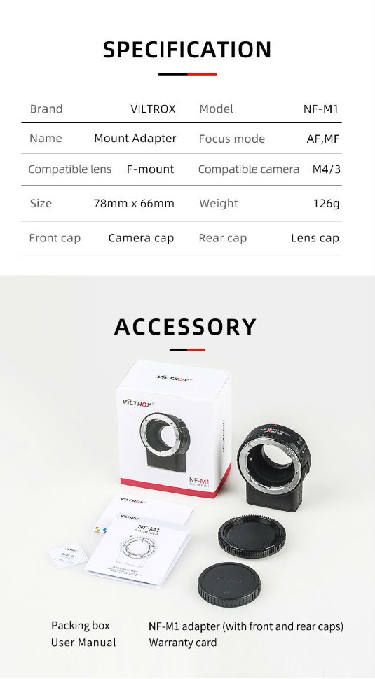 | Адаптер Viltrox NF-M1 выполнен из высокопрочного материала. Металлическое покрытие обеспечивает надежную защиту специализированного устройства от внешних факторов воздействия. В комплектацию входит сам адаптер, крышки, а также руководство пользователя |