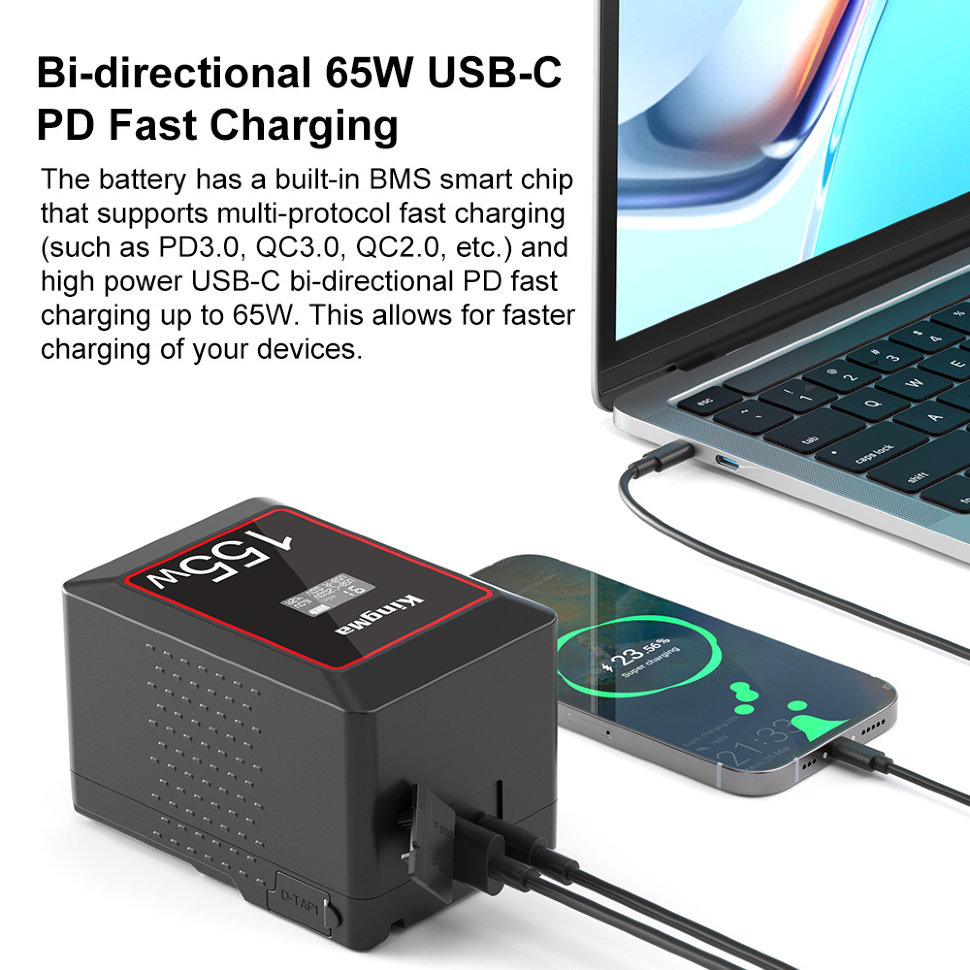 Аккумулятор типа Mini V-mount с уменьшенными габаритами. Поддерживает протокол быстрой зарядки Power Delivery 65 Вт на двухстороннем Type-C, что позволяет заряжать его без дополнительных приборов. Также может использоваться в качестве power bank для зарядки различных гаджетов через USB и Type-C порт |