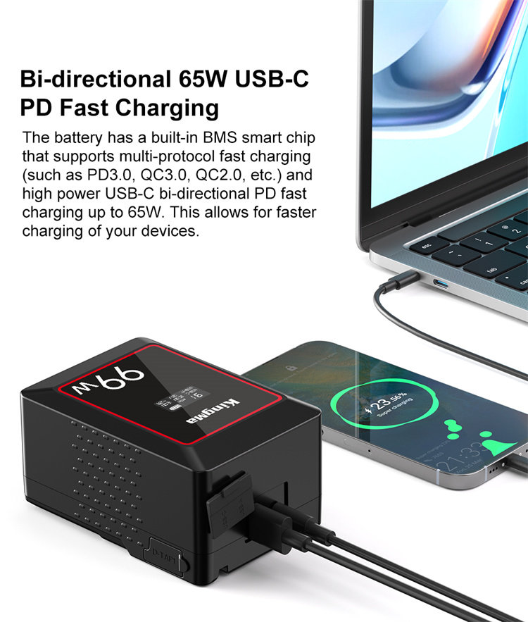 Аккумулятор типа Mini V-mount с уменьшенными габаритами. Поддерживает протокол быстрой зарядки Power Delivery 65 Вт на двухстороннем Type-C, что позволяет заряжать его без дополнительных приборов. Также может использоваться в качестве power bank для зарядки различных гаджетов через USB и Type-C порт |