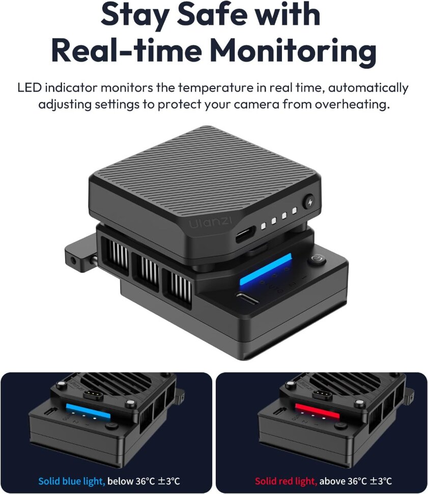 Аккумулятор разработан специально для системы охлаждения CU01. Литий-полимерный элемент емкостью 3000 мАч оптимизирован для работы, поддерживая стабильную температуру 8°C. Магнитная система крепления обеспечивает мгновенную установку и надежный контакт без использования кабелей. Полная зарядка аккумулятора занимает 2 часа через порт Type-C. Время работы варьируется в зависимости от выбранного режима: до 85 минут в экономичном режиме, до 70 минут в режиме максимальной производительности и до 65 минут в автоматическом режиме с адаптивным потреблением энергии