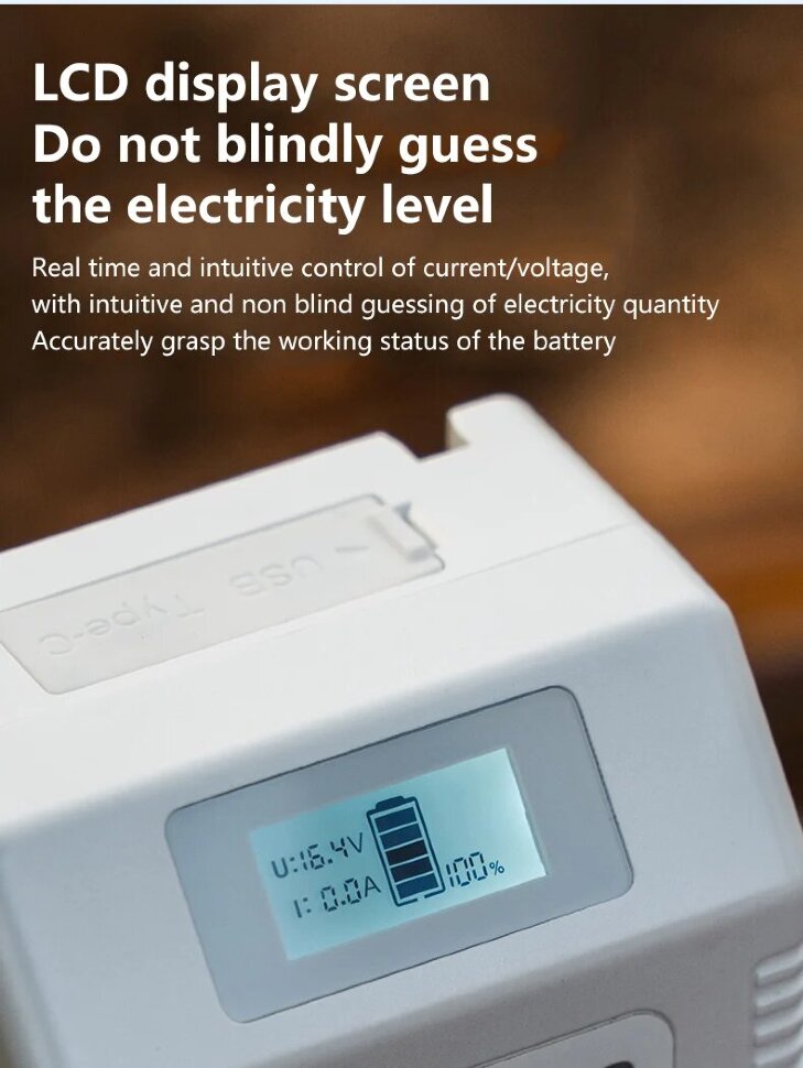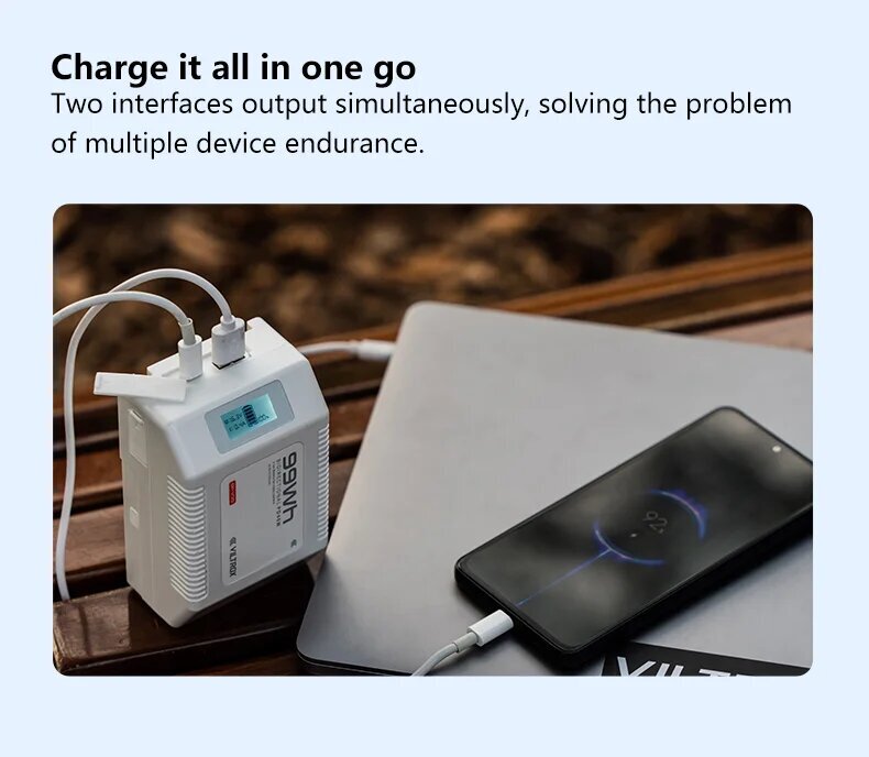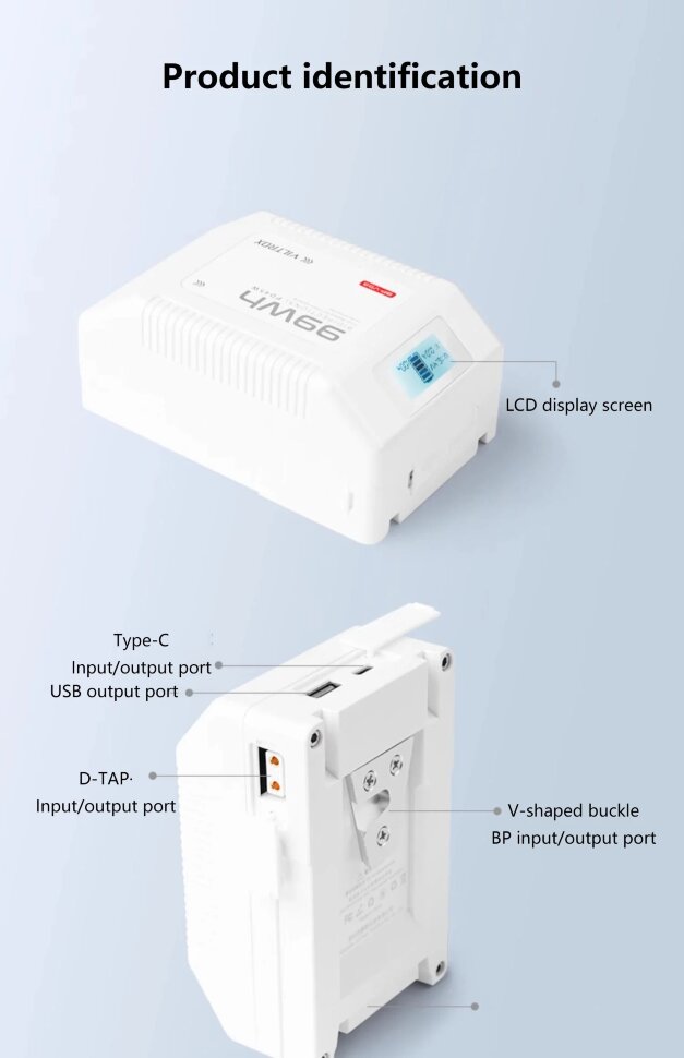 Декодированный аккумулятор типа V-mount с возможностью быстрой подзарядки от Type-C кабеля. Порт с поддержкой Power Delivery позволяет пополнить энергозапас не только самой батареи, но и подключенных гаджетов, словно это Power Bank. Помимо этого есть и выход USB (18 Вт) для прочих устройств, а также стандартный D-Tap. На корпусе расположен диспелй, для наиболее информативной работы с питанием |