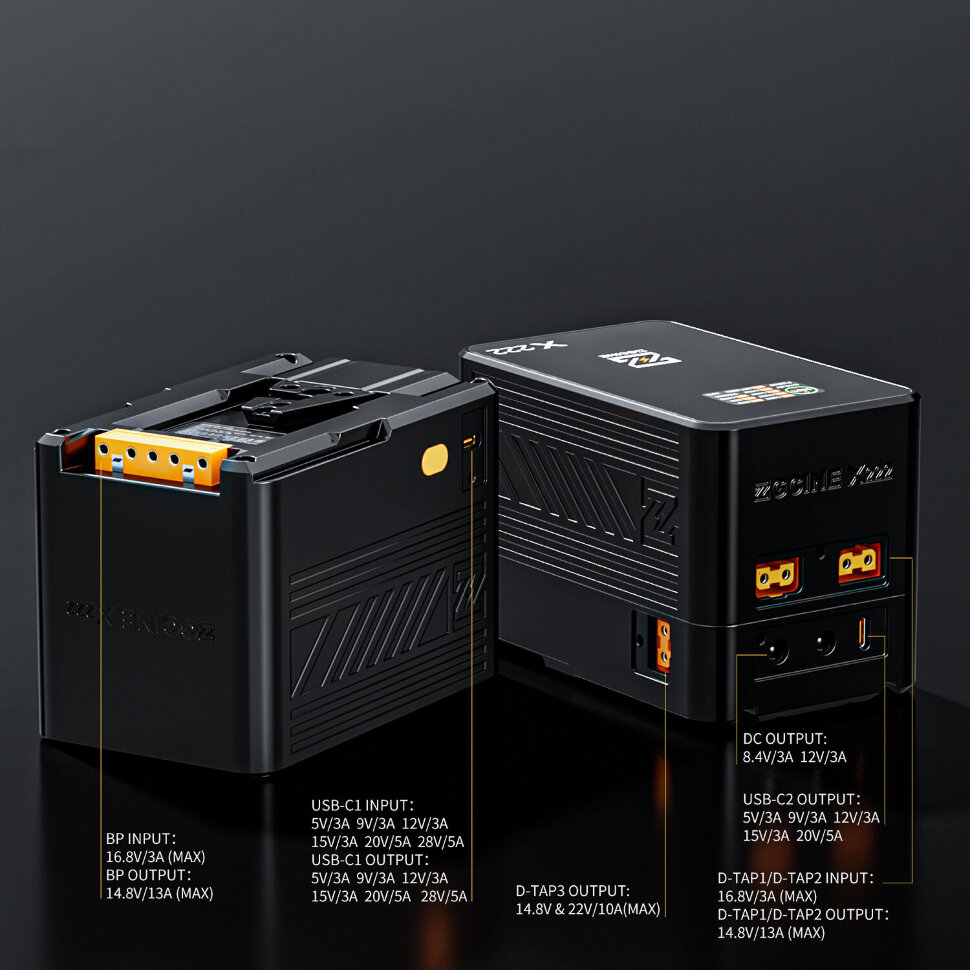 | Выход питания | D-Tap (P-Tap): 14.8В/13А D-Tap (P-Tap) #2: 22В/10А DC: 8.4В/3А, 12В/3А Type-C: 5В/3А, 9В/3А, 12В/3А, 15В/3А, 20В/5А, 28В/5А |