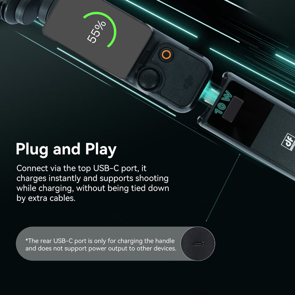 Универсальность и зарядкаНижняя резьба 1/4" позволяет крепить селфи-палку или монтировать рукоятку на штатив. Для подзарядки самой рукоятки используется порт Type-C — полный цикл занимает 110 минут. Совместима исключительно с DJI Pocket 3. |