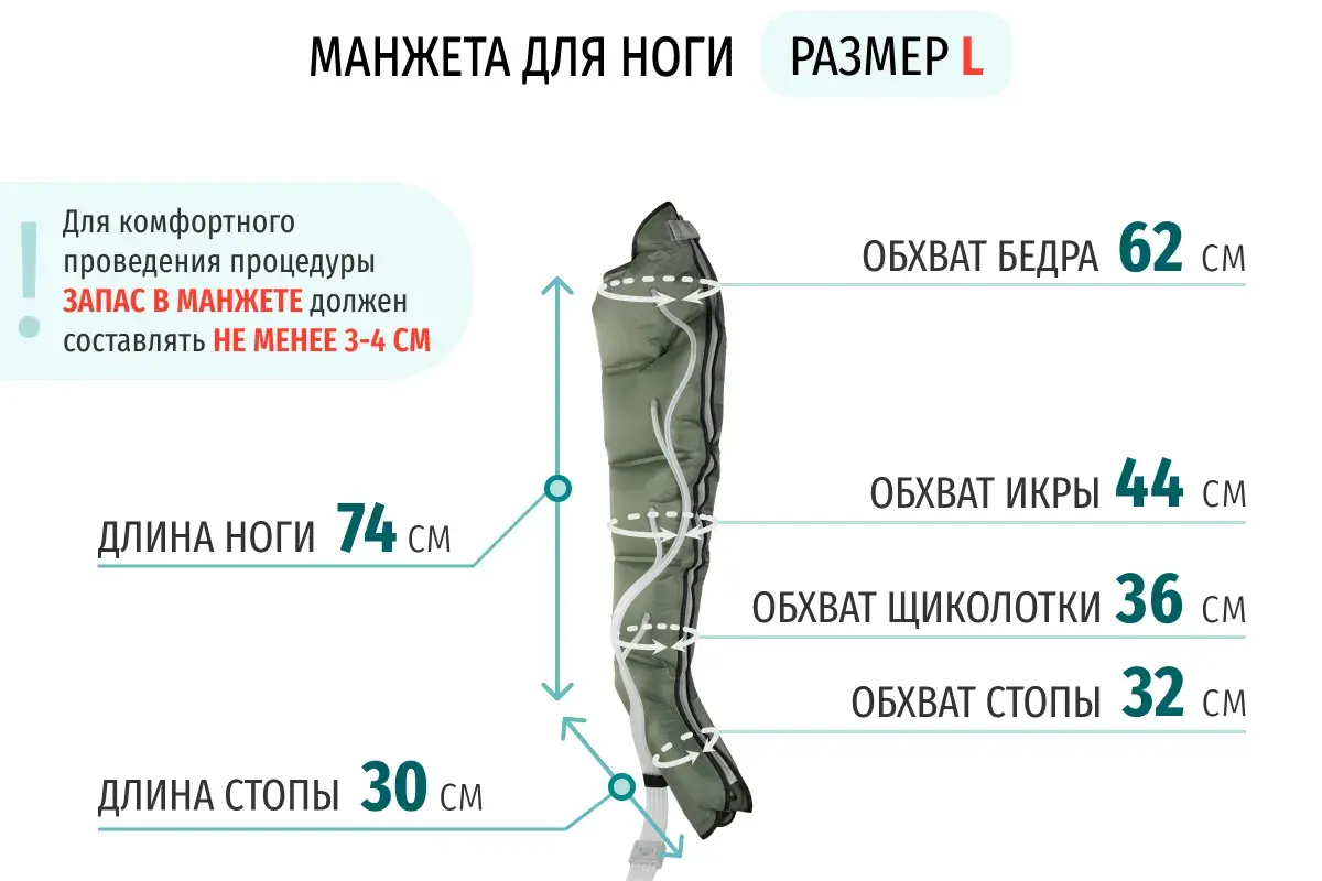 Как подобрать размер манжет для ног?Грамотно подобранные манжеты гарантируют, что процедура будет проведена правильно, а все нужные мышцы качественно проработаются. Перед покупкой массажного аппарата обязательно измерьте свои параметры и изучите информацию о размерах манжет в соответствующей вкладке. Если хотя бы один параметр манжеты превышается или равен меркам ноги, следует выбрать размер побольше или приобрести расширители. Манжеты для ног должны сидеть свободно, с запасом не менее 3–4 см в каждой области замера. Если нога длиннее манжеты, остановитесь на размере побольше. Короткая манжета будет массировать не всю ногу, а также может сползать. Если размер манжеты оказался мал, Вы всегда можете приобрести расширители. К данной комплектации доступна опция на 6 /12 см. При необходимости допускается использование 2 и более расширителей. Подробнее о выборе размера манжет для прессотерапии и особенностях использования расширителей Вы можете узнать из нашей статьи. |