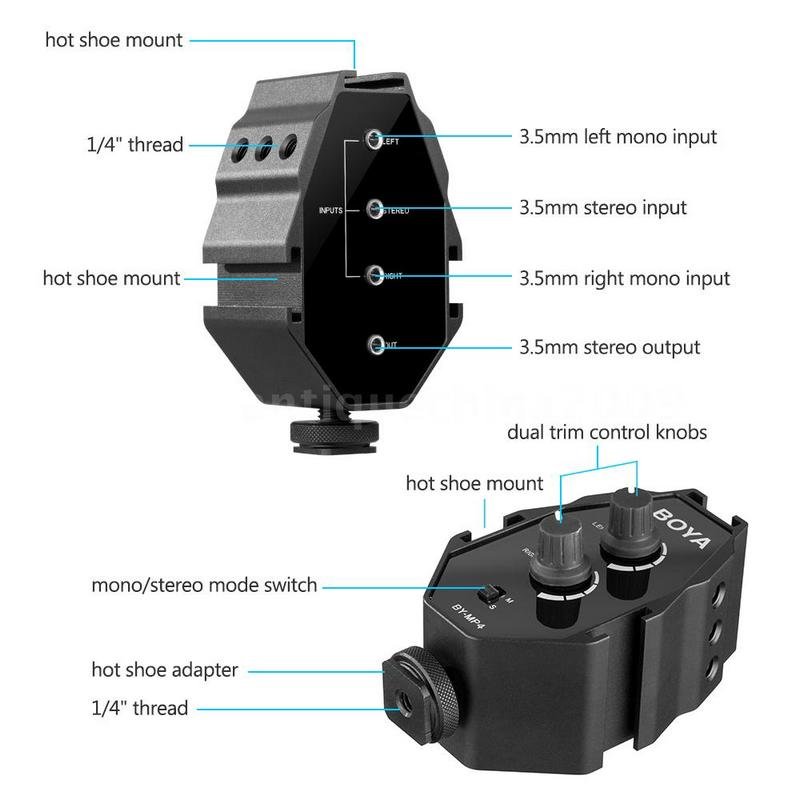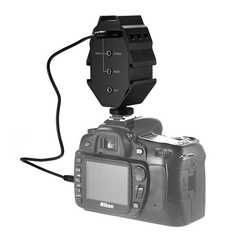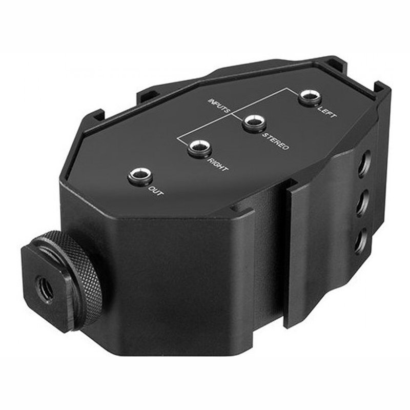 Устройство не требует отдельного питания. На лицевой панели присутствует регулировка левого и правого канала, а также переключение режимов моно/стерео. На корпусе предусмотрены крепления типа башмак, что позволяет установить на микшер направленный микрофон, приемник радиосистемы или иное съёмочное оборудование |