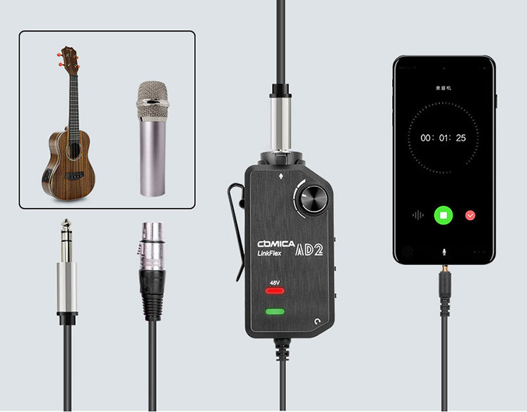 LinkFlex AD2 позволяет подключить музыкальные электроинструменты с штекером Jack 6.35 мм, или микрофоны с XLR к смартфону или цифровой камере с аудиовходом mini Jack 3.5 мм. С помощью аудиоадаптера вы сможете записать музыкальную партию или голос на персональный гаджет, или значительно улучшить качество звука на записи |