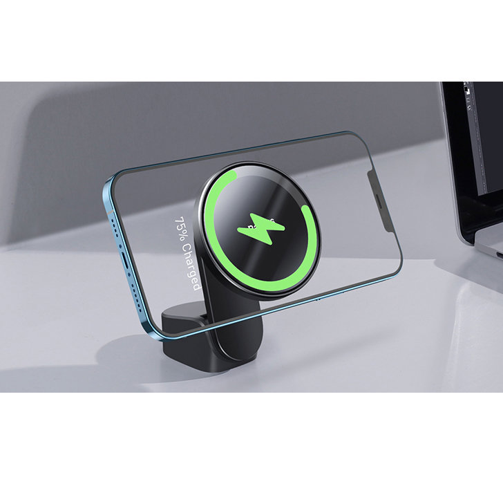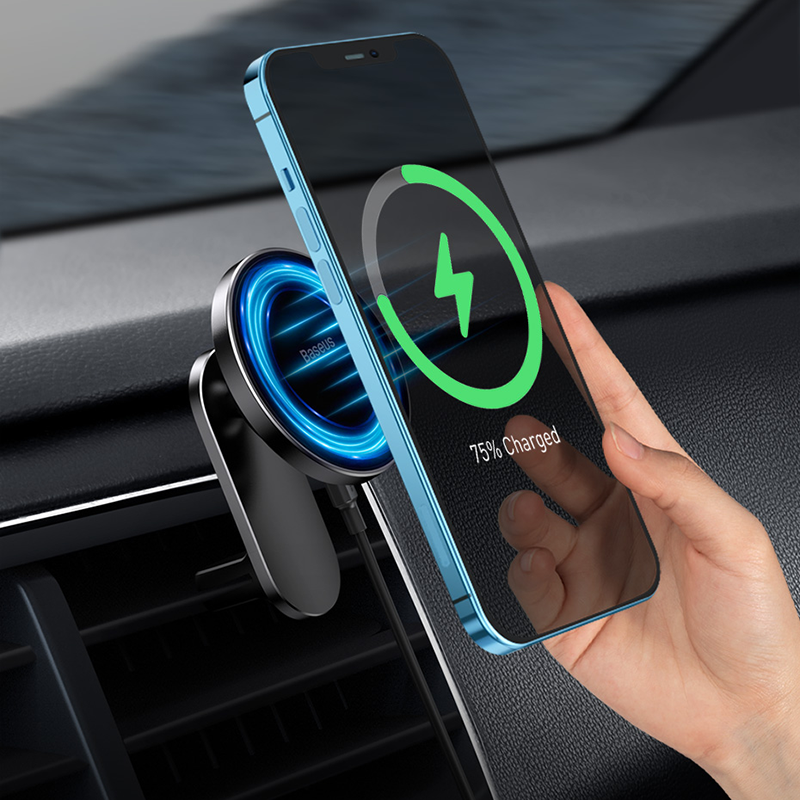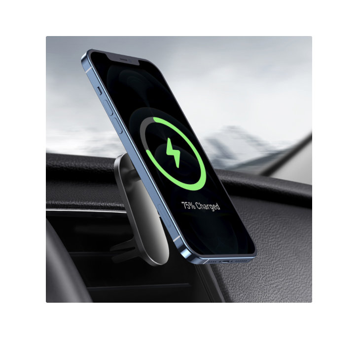 Прочный и надежный держатель смарфтона в авто. Модель имеет строенную беспроводную зарядку на 15 Вт и магнитный адаптер Apple Magsafe для нового поколения iPhone |