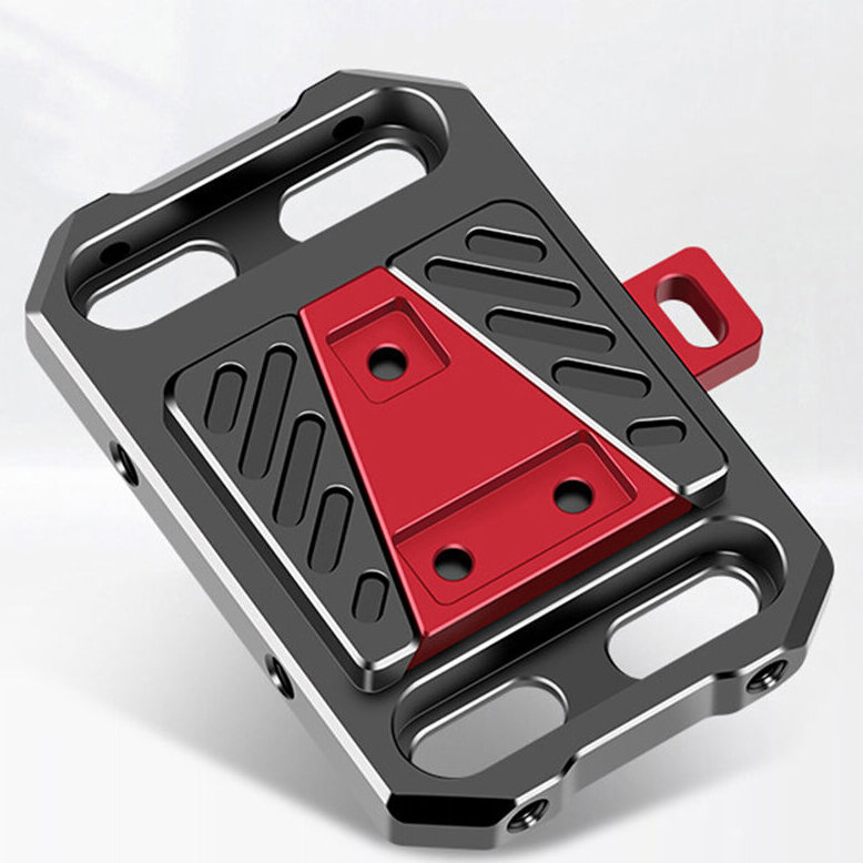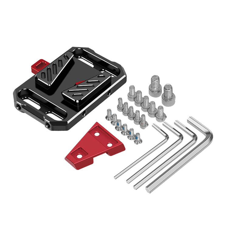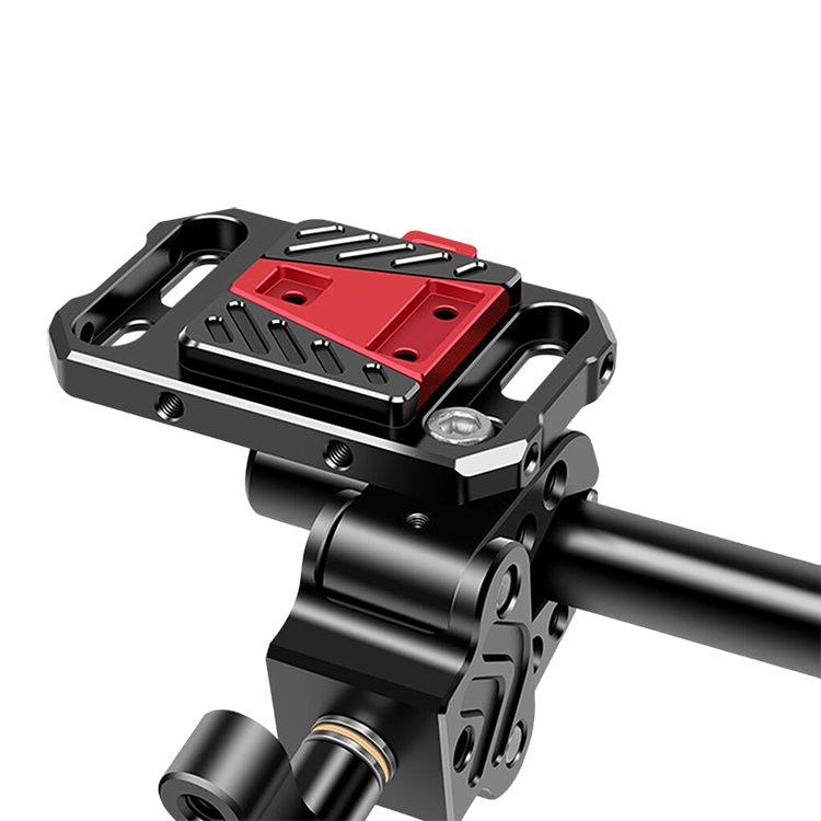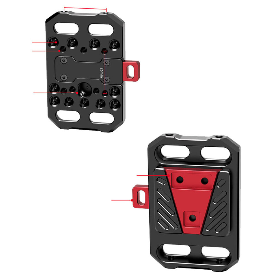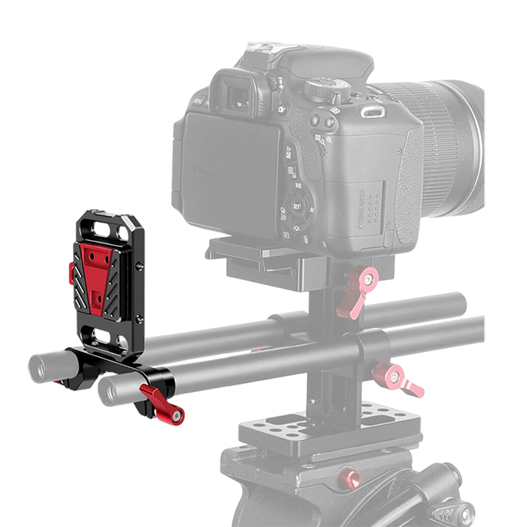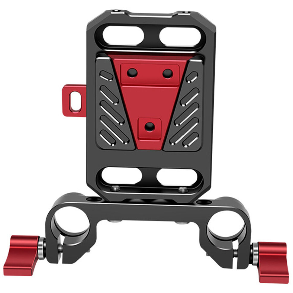 Площадка для закрепления аккумулятора типа mini V-mount на систему риг. Имеет множество точек для различных креплений, в том числе на опору направляющих 15мм (не входит в комплект). Блокирующий механизм предотвращает случайное выпадение аккумулятора  |