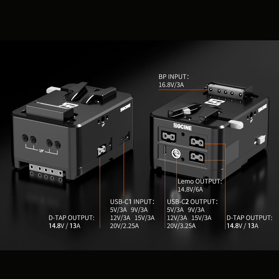 | Выход питания | D-Tap (P-Tap): 14.8В/13A Lemo: 14.8В/6А Type-C: 5В/2A; 9В/1.8A; 12В/2A; 15В/2.2A; 20В/3.25A |