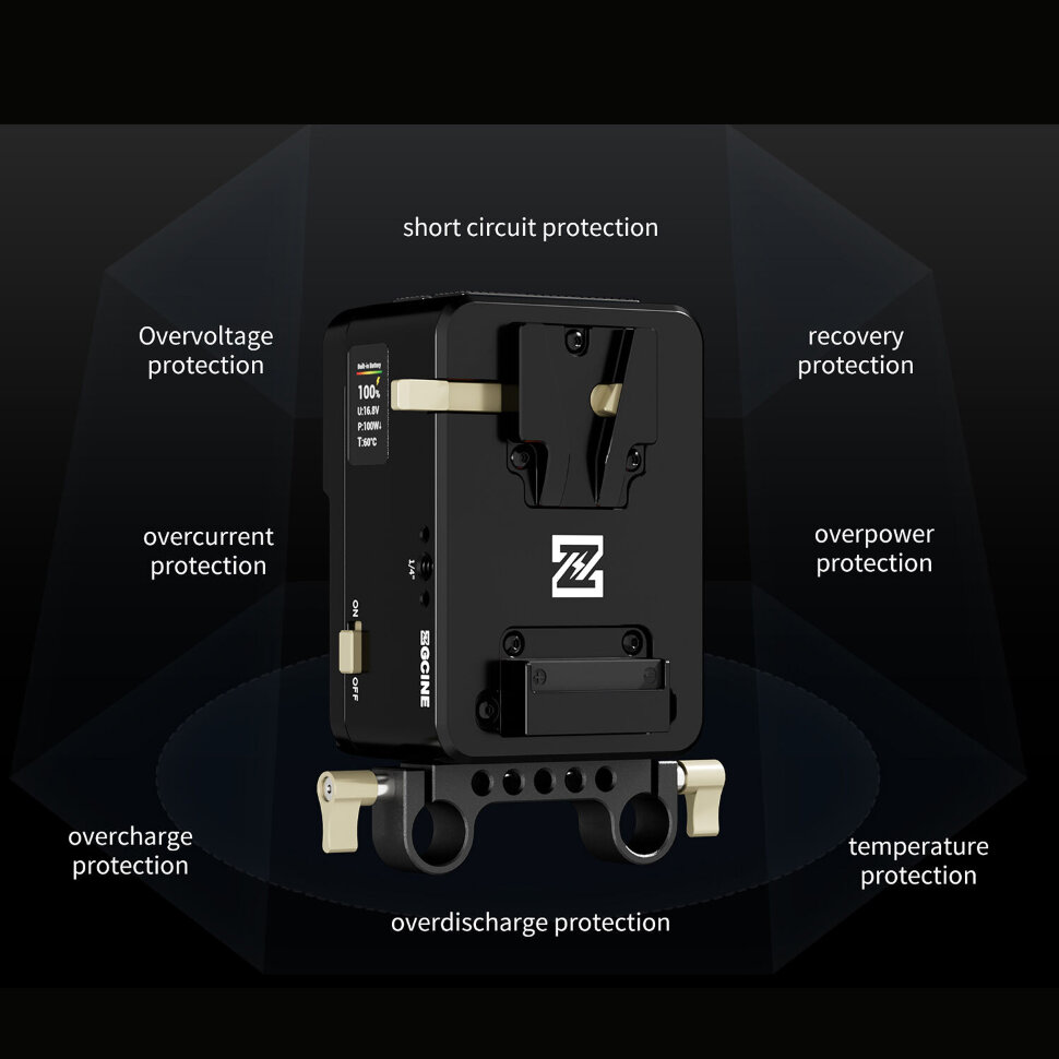 Интеграция в ригУстройство интегрируется в профессиональные риги благодаря креплению на 15-мм направляющих и резьбовым отверстиям 1/4" для дополнительных аксессуаров. На боковой панели расположен интеллектуальный дисплей, отображающий уровень заряда и параметры нагрузки, что упрощает мониторинг в динамичных условиях съемки. Сочетание горячей замены аккумуляторов, мощных выходов и эргономичного монтажа делает площадку решением для автономной съёмки |