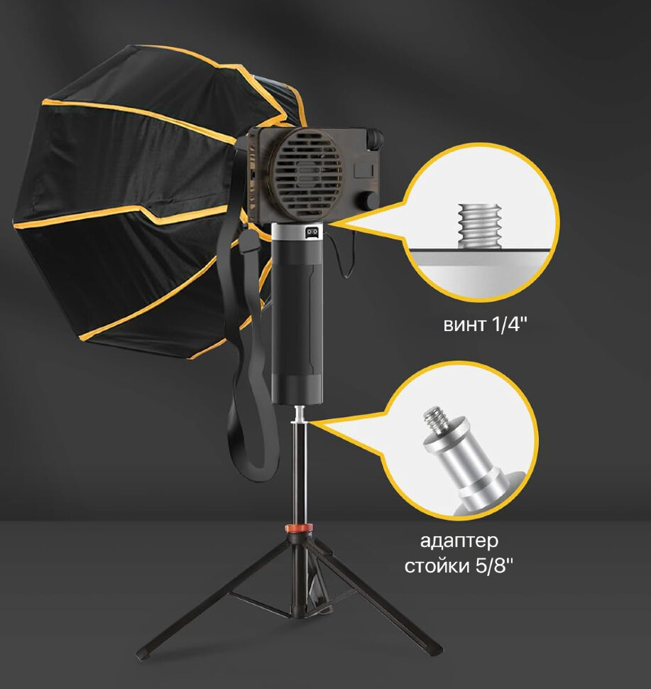 Он оснащен стандартными резьбовыми отверстиями 1/4 дюйма в верхней части и 1/4 - 3/8 дюйма в нижней части для установки на на штатив, слайдер и так далее. |