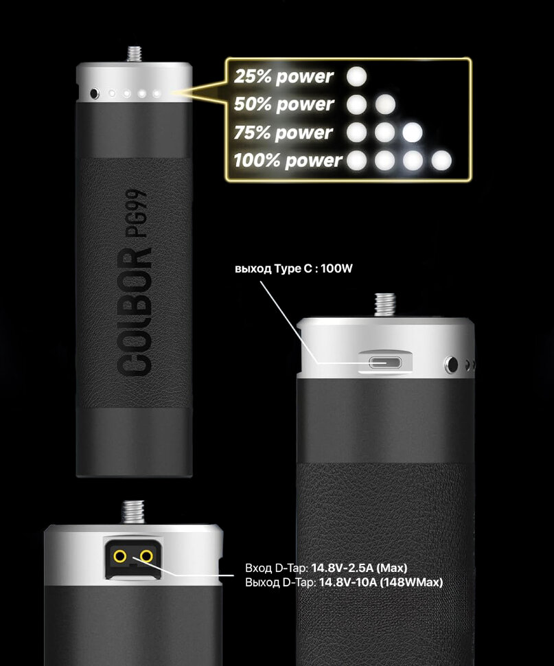 | Выход питания | D-Tap (P-Tap): 14.8V⎓10A (148W MAX) Type-C: PD3.0 5V/9V/12V/15V⎓3A; 20V⎓5A (100W max) |