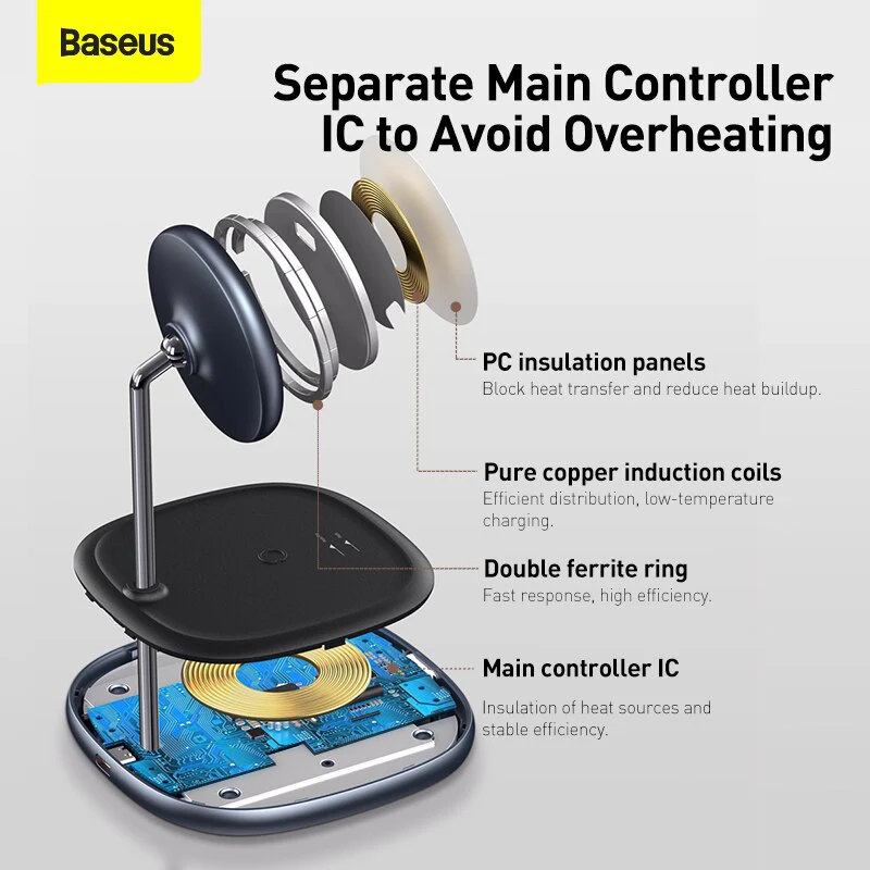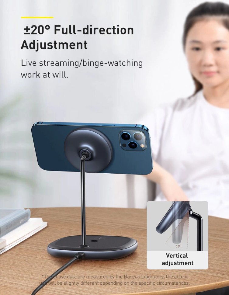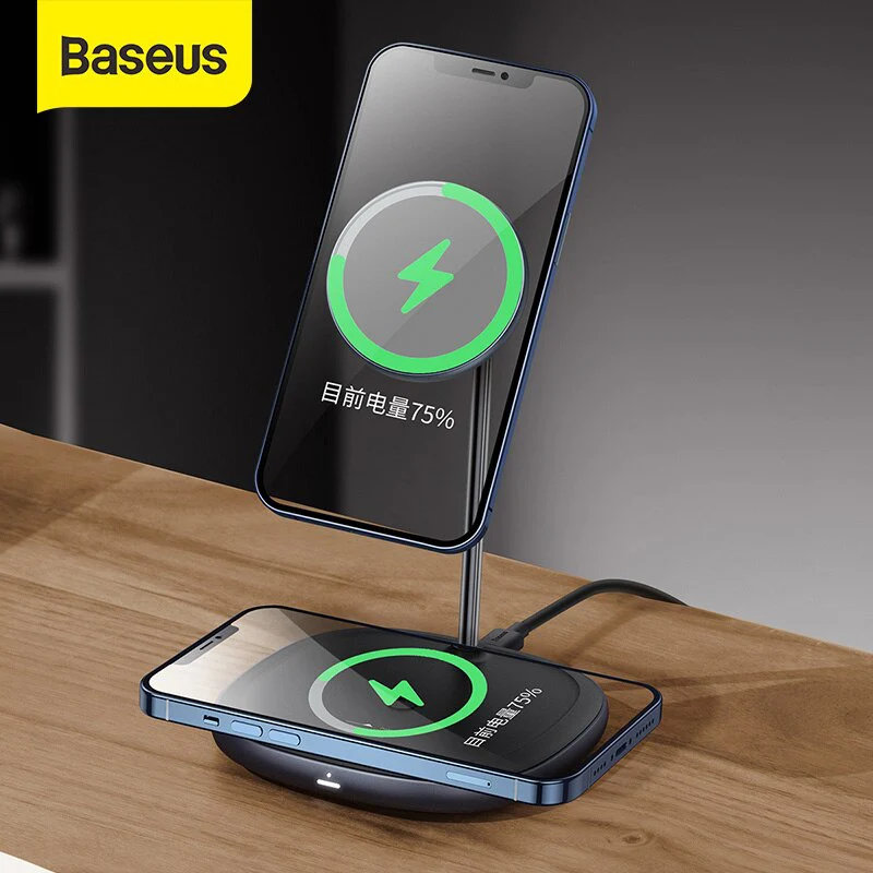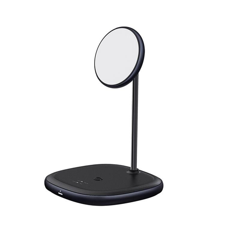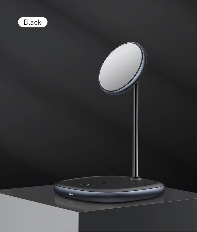 Двойная беспроводная зарядка имеет держатель для нового поколения iPhone с magsafe, а также универсальную площадку внизу совместимую со всеми соответсвующими гаджетами |