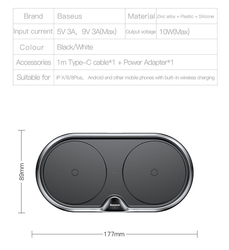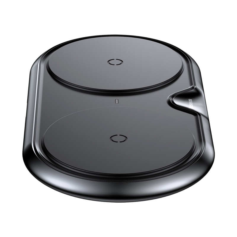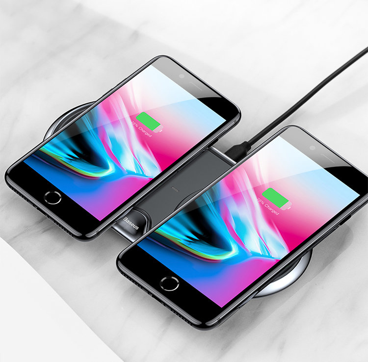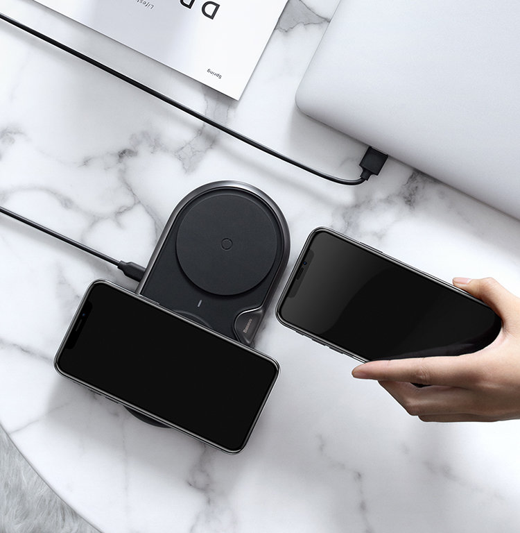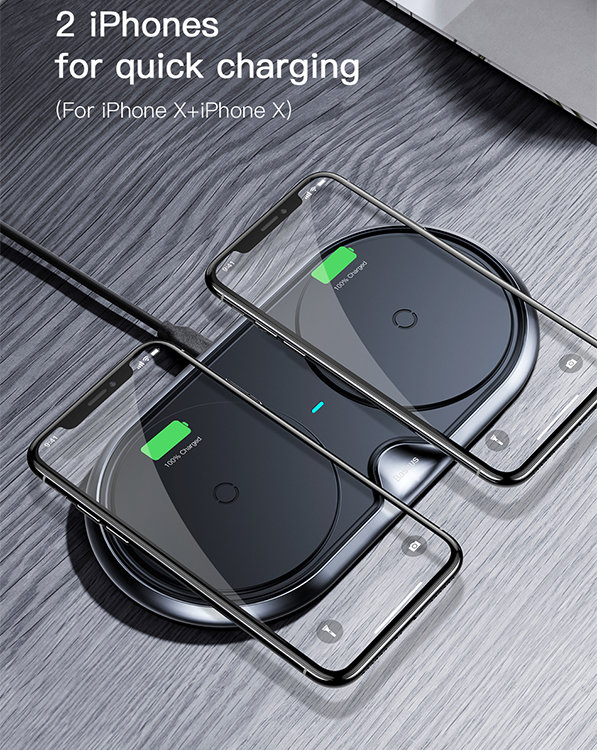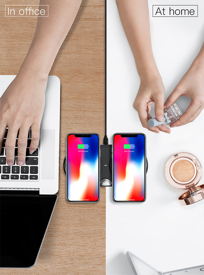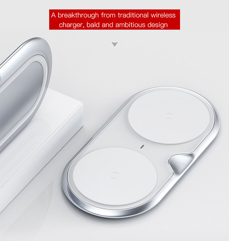 Беспроводное зарядное устройство в стильном металлическом корпусе позволит пополнить заряд батареи сразу двух устройств и сделает это невероятно быстро! |