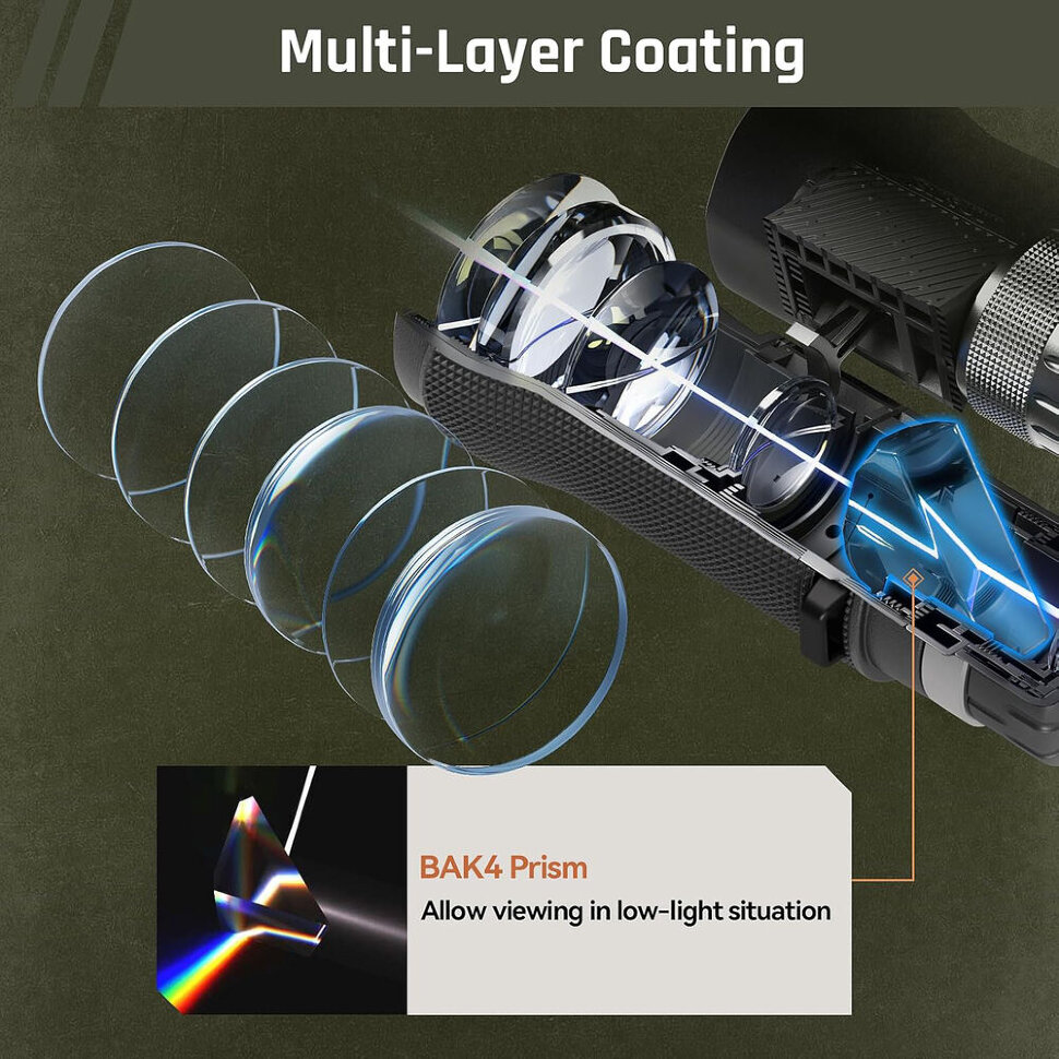 Мощный бинокль с 10-кратным увеличением и линзами 42 мм, обеспечивающими яркое и чёткое изображение даже при слабом освещении. Оптическая схема с четырьмя элементами из стекла с ультранизкой дисперсией гарантирует высокую цветопередачу, контрастность и чёткость при 88.5% светопропускании. Призмы типа BAK4 и многослойное покрытие сводят искажения к минимуму, а широкое поле зрения позволяет охватить обширную сцену |