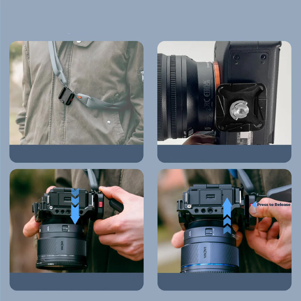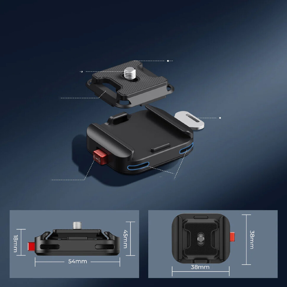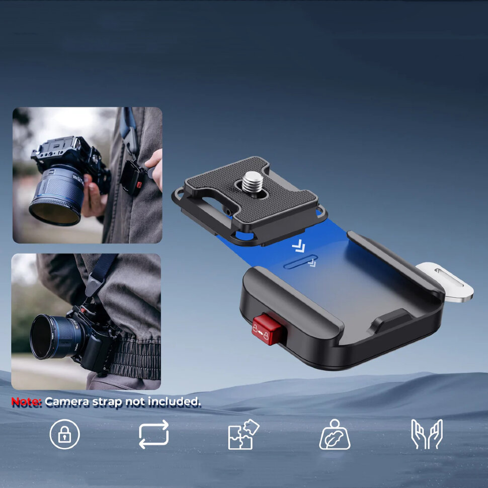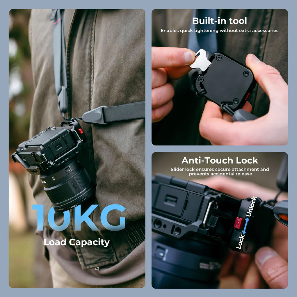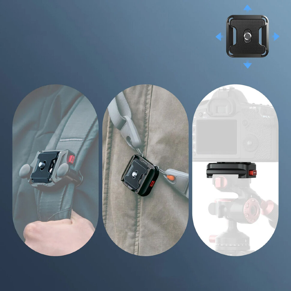 Надежность и ПрактичностьКонструкция крепления гарантирует безопасное удержание камеры благодаря слайдеру-предохранителю, предотвращающему случайное расстегивание. При весе самой пластины всего 75 грамм, система уверенно выдерживает нагрузку до 10 кг. Механизм безопасности обеспечивает защиту от непреднамеренного отсоединения, позволяя сосредоточиться на съемке даже в динамичных условиях |