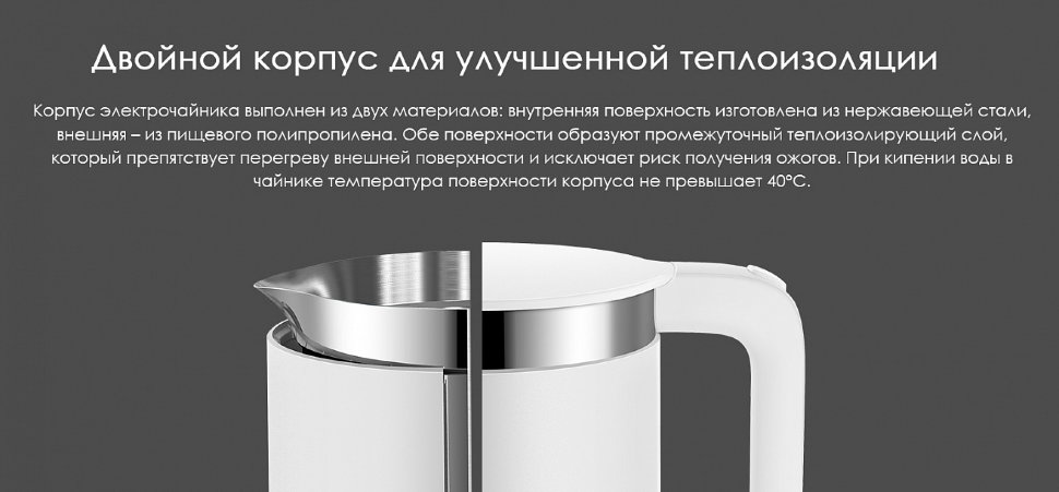 БезопасностьSmart Kettle снабжен функцией блокировки включения при пустой колбе. Он защищен двойной стенкой, благодаря чему не нагревается. К корпусу можно прикасаться без риска обжечься. Разработчики Xiaomi внимательно подошли к вопросам электробезопасности. Предусмотрена защита от утечки тока при попадании на подставку |