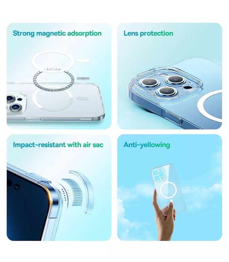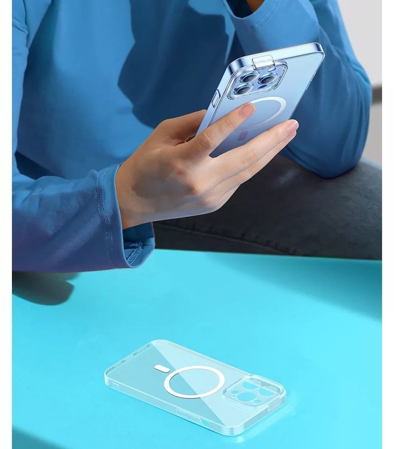 Полностью прозрачный чехол с установленным магнитным кольцом для работы с аксессуарами Apple MagSafe. Благодаря этой особенности вы сможете использовать соответствующие беспроводные зарядки, кошельки и держатели, с самым надежным креплением на магнитах N52 |