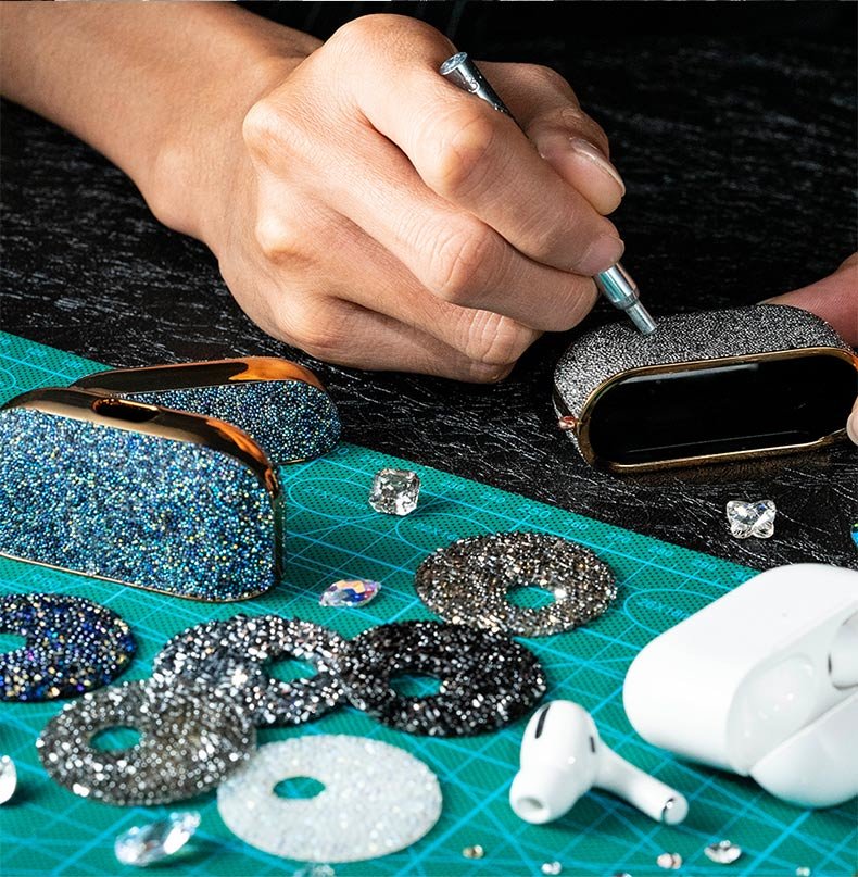 Swarovski - последнее слово роскошиИзюминкой изделий от компании PQY является использование в своих аксессуарах кристаллов Swarovski. Данная серия кейсов для Airpods Pro полностью инкрустирована этими драгоценными украшениями, придавая чехлам особую роскошность и премиальность |