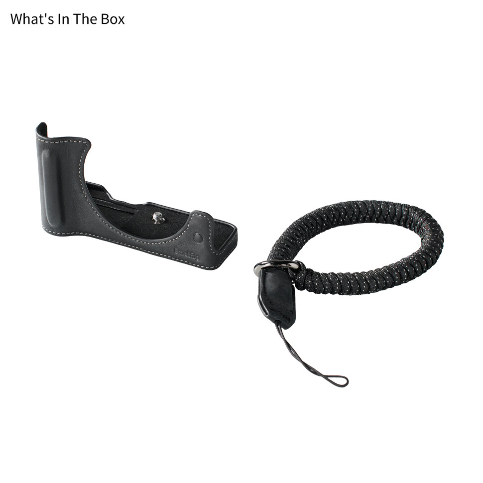 Чехол Leather Half Case Kit для Canon R50 изготовлен из прочной дышащей натуральной кожи, обеспечивающей улучшенный хват и долгий срок службы. Интегрированная поролоновая рукоятка повышает стабильность и комфорт удержания камеры, а подкладка из микрофибрового замка гарантирует плотную защиту корпуса со всех сторон. Конструкция сохраняет беспрепятственный доступ ко всем портам и элементам управления, включая кнопку записи (REC), отсек аккумулятора, слот для карты памяти и резьбовое отверстие для вертикального крепления. Комплект дополнен практичным плетеным запястным ремешком с регулируемой длиной и грузоподъемностью до 10 кг, что повышает удобство переноски и безопасность использования камеры