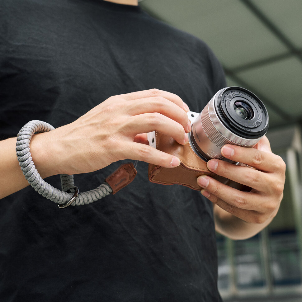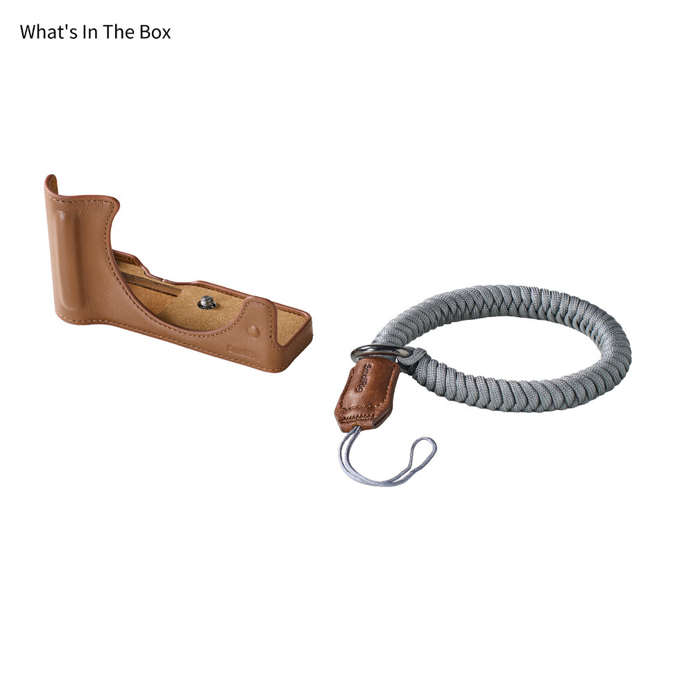 Чехол Leather Half Case Kit для Canon R50 изготовлен из прочной дышащей натуральной кожи, обеспечивающей улучшенный хват и долгий срок службы. Интегрированная поролоновая рукоятка повышает стабильность и комфорт удержания камеры, а подкладка из микрофибрового замка гарантирует плотную защиту корпуса со всех сторон. Конструкция сохраняет беспрепятственный доступ ко всем портам и элементам управления, включая кнопку записи (REC), отсек аккумулятора, слот для карты памяти и резьбовое отверстие для вертикального крепления. Комплект дополнен практичным плетеным запястным ремешком с регулируемой длиной и грузоподъемностью до 10 кг, что повышает удобство переноски и безопасность использования камеры