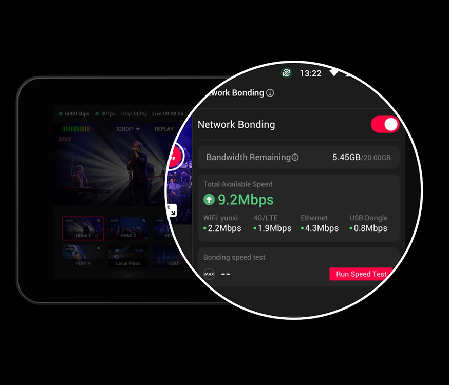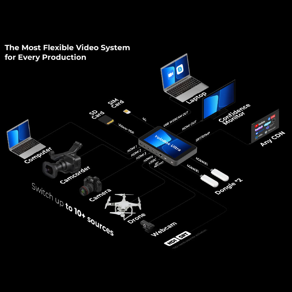 Мобильное подключение.3 SIM-карты, 5 подключений.С сотовым бондингом YoloLiv вы сможете наслаждаться беспрецедентным подключением к глобальному интернету, где бы вы ни находились. Он может объединить до 5 сетевых соединений 4G LTE (1х), Wi-Fi (1х), Ethernet (1х) и USB-модемы (2х) - гарантируя, что ваш поток не пропустит ни одного события в самых сложных сетевых условиях |