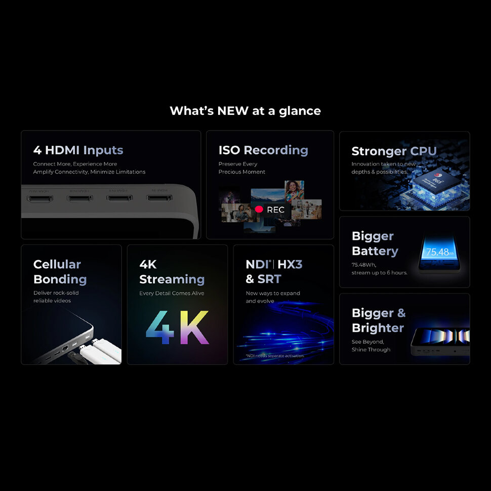 UltraПоследняя версия популярной портативной стрим студии серии Yolobox с ультра возможностями! Устройство получило более мощный процессор, 4 HDMI входа, возможность транслировать 4K. Процессор 865 QualComm Snapdragon даёт значительный прирост производительности в отличие от прошлых моделей серии, а также увеличился объем памяти до 8Гб/128Гб |