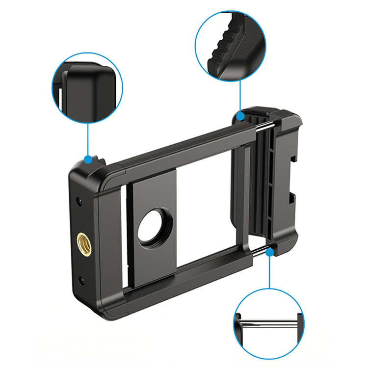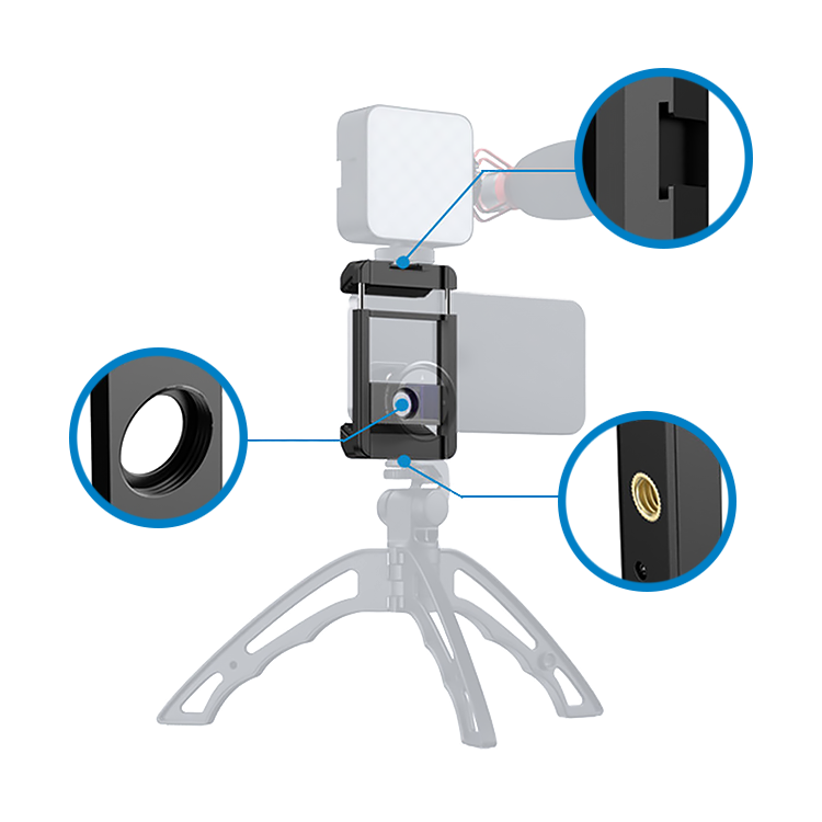 Конструкция подойдет для гаджетов шириной от 66 до 95 мм. Установить её можно на стандартный штативный винт 1/4", а также предусмотрен холодный башмак для осветителя или микрофона |