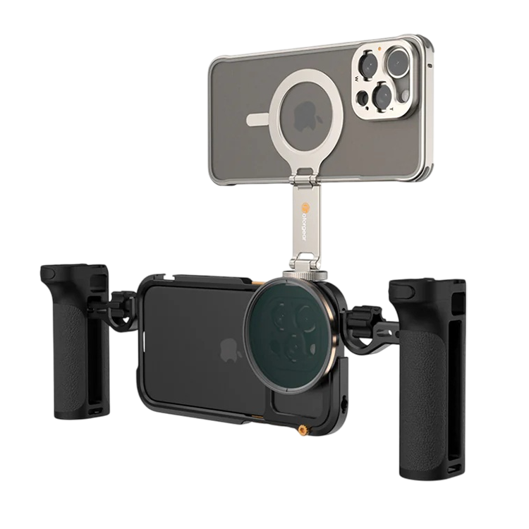 Держатель FotorGear сочетает в себе холодный башмак и магнитное крепление MagSafe, обеспечивая надежную фиксацию смартфона в любых условиях. Корпус выполнен из прочного металла с титановым покрытием, что придает ему элегантный внешний вид и высокую устойчивость к внешним воздействиям. Одна сторона крепления совместима с холодным башмаком и надежно фиксируется на камере или клетке |