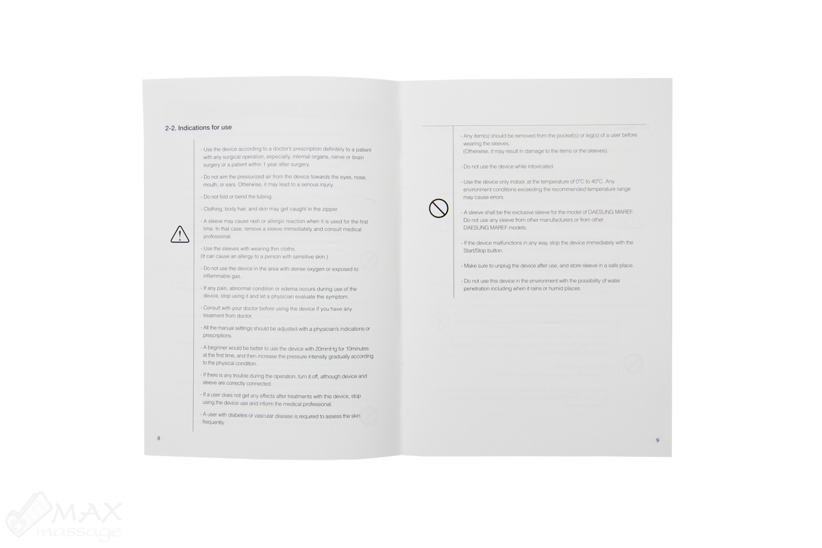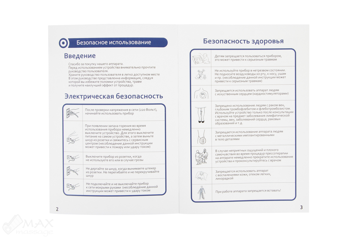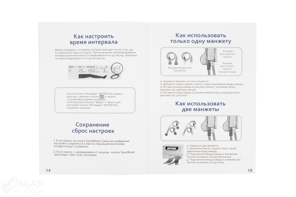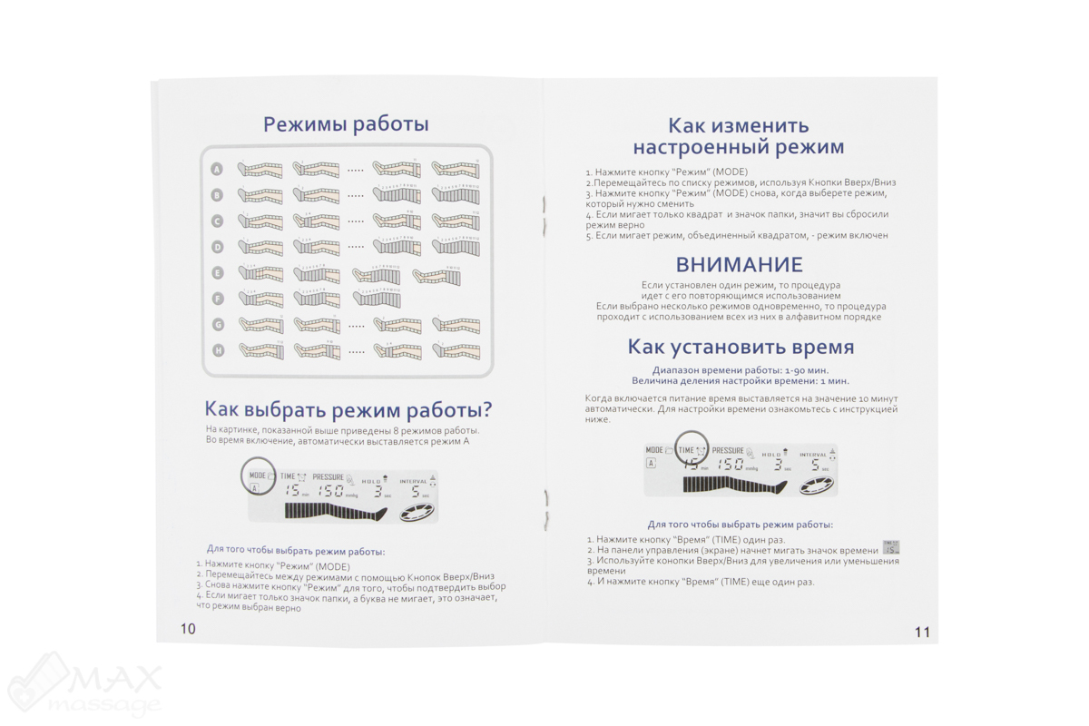 - 8 программ массажа: массаж, лимфодренаж, массаж и лимфодренаж по две/четыре камеры, массаж по две/четыре камеры с функцией «обратная волна»;