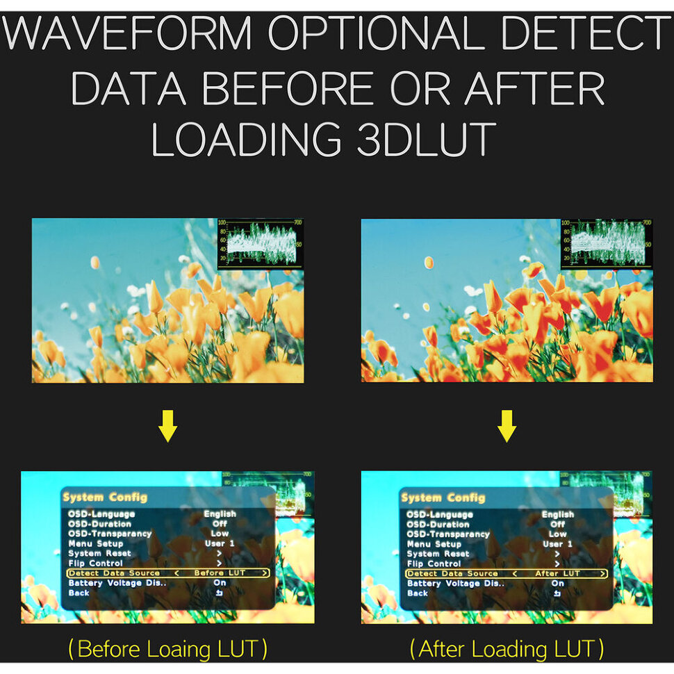 4K + 3D LutУстройство поддерживает вход HDMI с разрешением до DCI 4K 30p, предоставляя возможность работы с высококачественным видеосигналом. Интегрированные инструменты анализа изображения включают осциллограмму яркости, гистограмму, зебру, ложный цвет, вектроскоп и настраиваемый фокус-пикинг, которые помогают контролировать экспозицию и фокус в реальном времени. Загрузка пользовательских 3D LUT через порт USB позволяет применять цветовые профили непосредственно во время съемки, причем осциллограмма может анализировать данные до или после применения LUT для точной цветокоррекции |