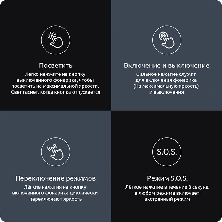 Простое управлениеБоковая кнопка дает возможность включать и выключать фонарик. Легкое нажатие включает освещение на максимальной яркости. Переключаться между режимами можно с помощью еще одного нажатия |