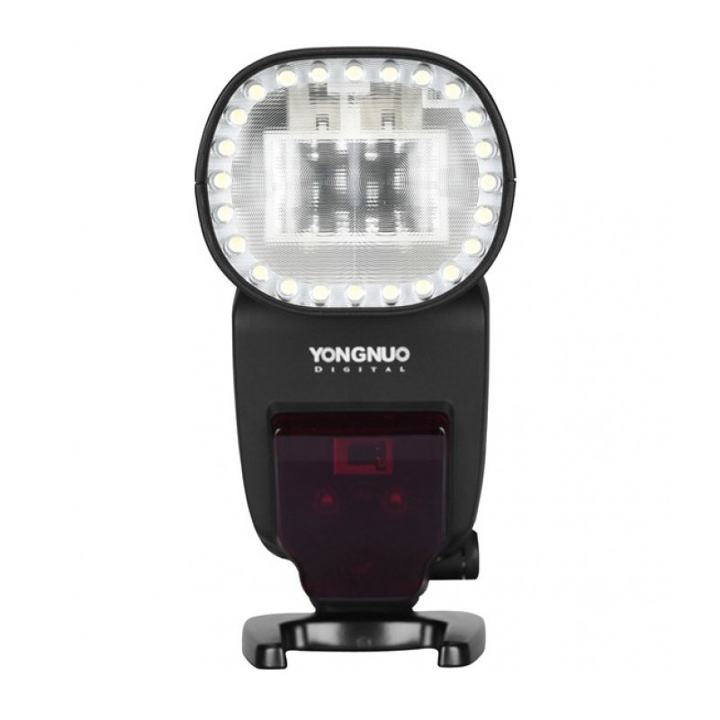 Вспышка для системы Canon с мощным постоянным светом. Отличительной особенностью осветительного устройства является наличие кольца светодиодов, расположенных по периметру вокруг основной вспышки. Они имеют мощность 2 Вт и могут служить моделирующим светом или светом для видеосъёмки |