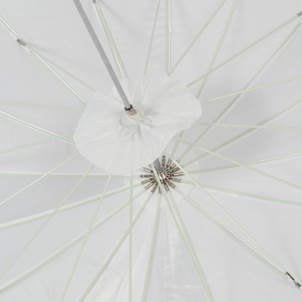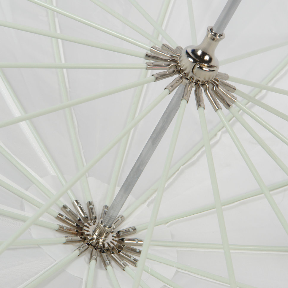 Конструкция зонта состоит из 16 спиц, которые формируют равномерное круглое световое пятно. Белый полупрозрачный материал зонта позволяет свету проходить сквозь него, рассеивая его и создавая мягкий эффект |