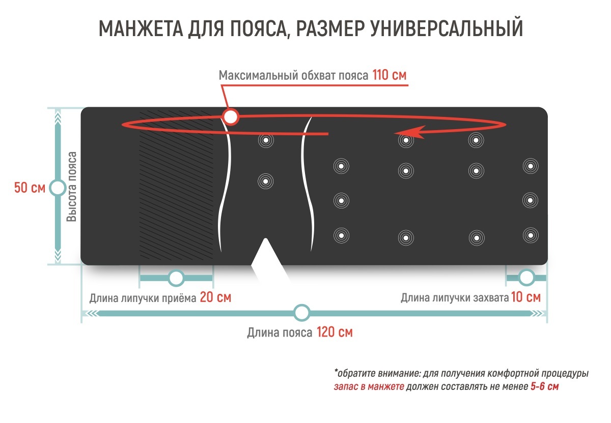 Когда вы будете надевать манжет, правильно обмотайте необходимые области: живот, поясницу, бока, бедра (рекомендуется сделать упор на область таза).