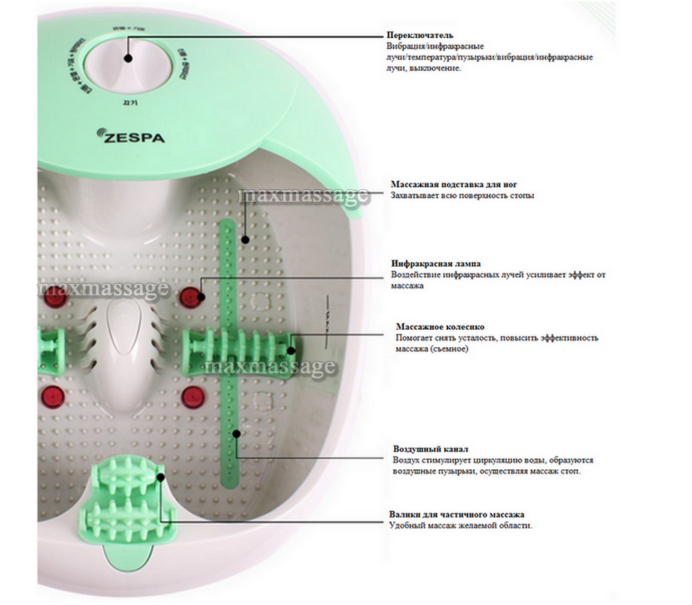 Ролик/Инфракрасные лучи. 4 инфракрасных лампы делают массаж более эффективным, встроенный массажный ролик снимает усталость с уставших ног. (съемный ролик)
