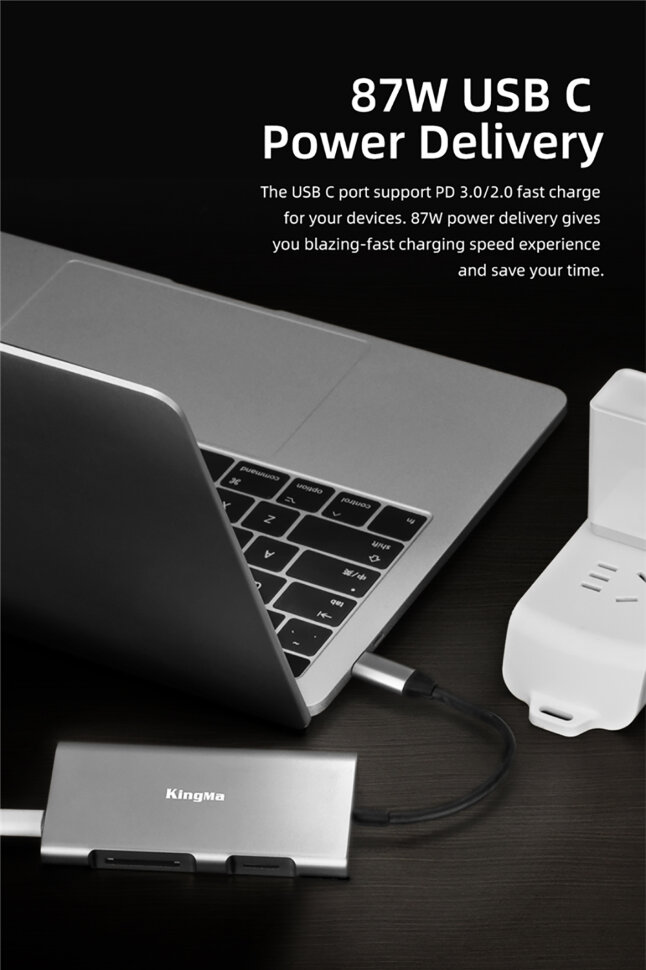Сквозной Type-C даёт возможность заряжать подключенное устройство благодаря поддержке Power Delivery 87 Вт. ПРочная конструкция их алюминия выдержит частые путешествия, а встроенный кабель даст гибкость в организации рабочего стола |