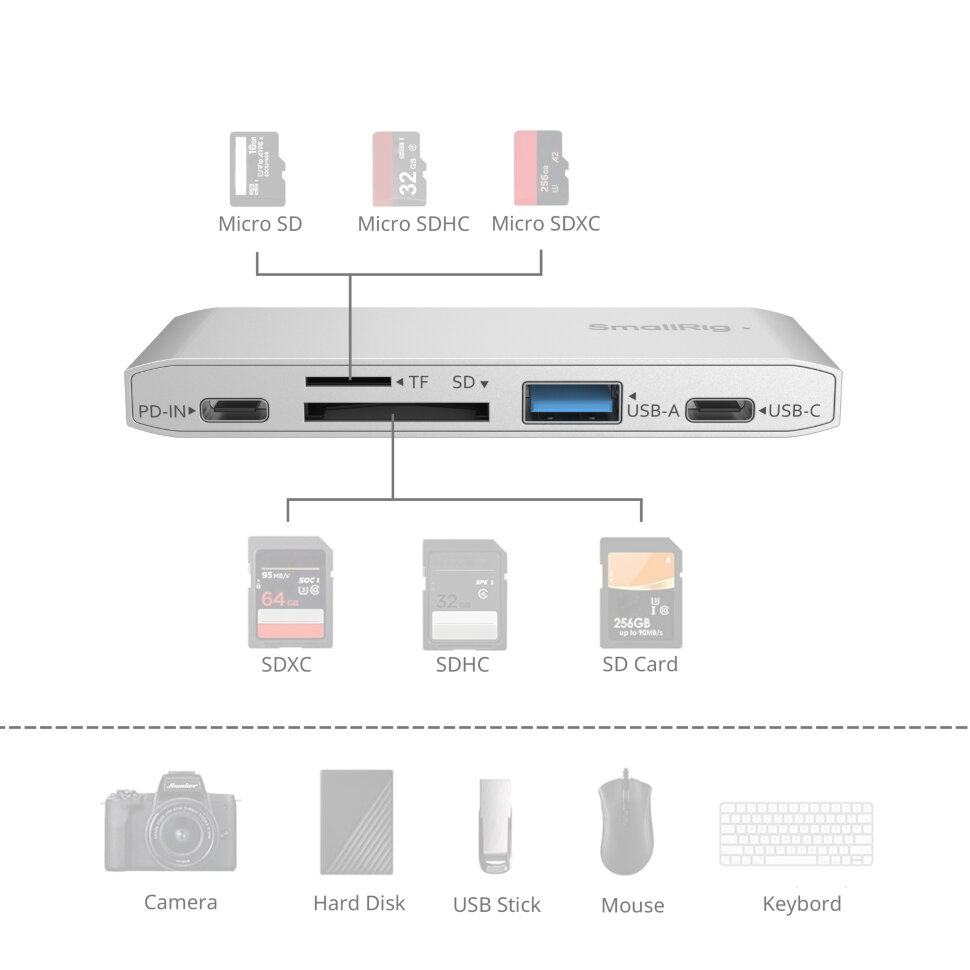 Скорость и универсальность в одном хабеХаб-картридер сочетает мощную зарядку и молниеносную передачу данных. С двумя портами Type-C и USB (5 Гбит/с), а также слотами для SD и micro SD карт, он обеспечивает одновременное подключение камер, смартфонов и накопителей. Сквозной порт Type-C PD 65W быстро заряжает устройства, пока вы передаете файлы — 1 ГБ всего за 2 секунды. Совместим с Android, iOS, Windows и macOS, что делает его идеальным спутником в путешествиях, студии или на съемочной площадке. Компактный и надежный, хаб упрощает работу с мультимедиа без компромиссов в скорости
