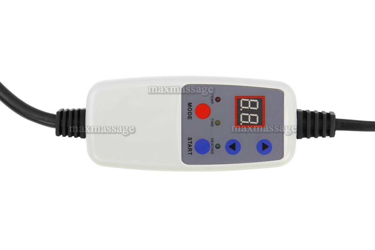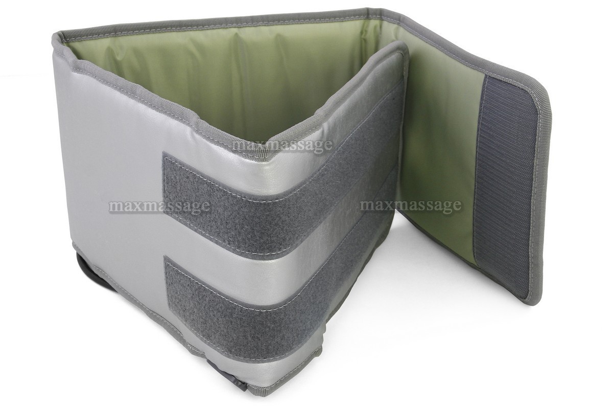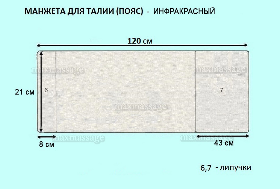 Ширина разогревающего пояса составляет 21 см, а длина – 120 см. Благодаря удобной липучке посадку можно регулировать в зависимости от объёмов тела. Запускать процедуру можно при помощи пульта дистанционного управления.