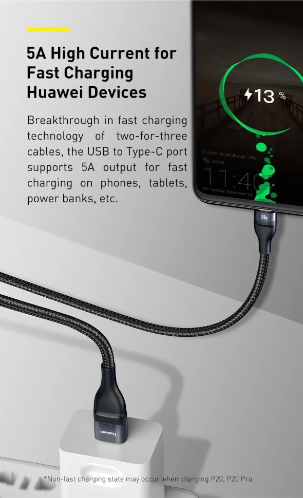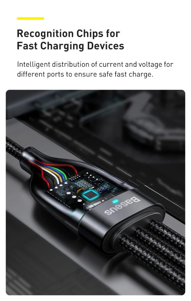 Светодиодный индикатор дает возможность проверять состояние заряда подключенного устройства. Кабель поддерживает технологию быстрой зарядки Baseus Flash Series II. Встроенный чип обеспечивает оптимальное распределение мощности между устройствами |