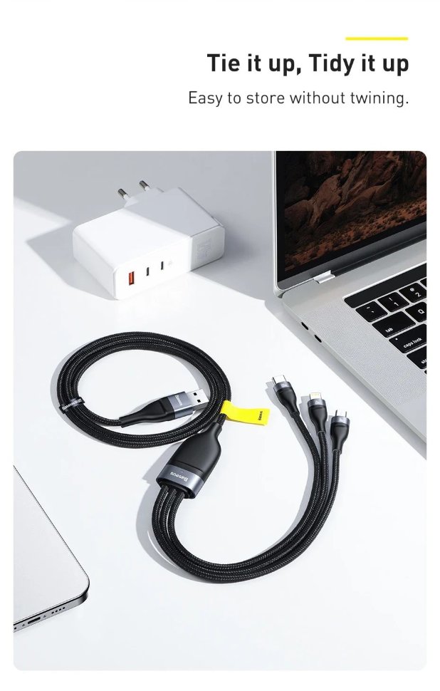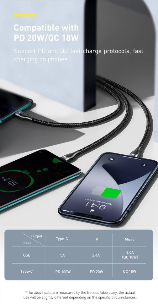 Многофункциональный кабель со множеством вариантов подключения, что делает его невероятно удобным. С одной стороны Type-C и адаптер на стандартный USB, а с другой сразу три разъёма - Type-C до 100 Вт, Lightning до 18 Вт и micro USB до 13 Вт |
