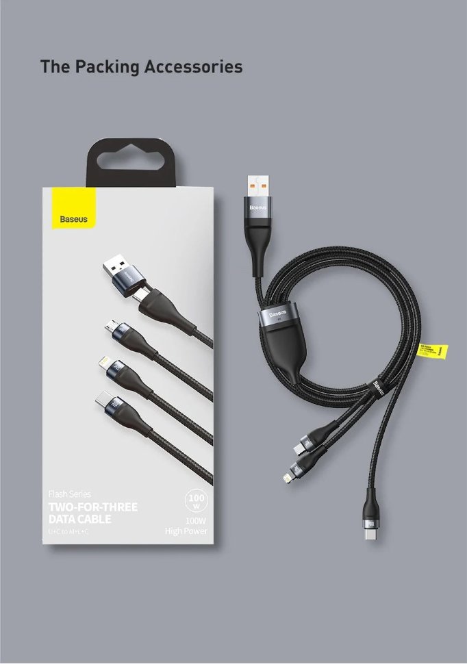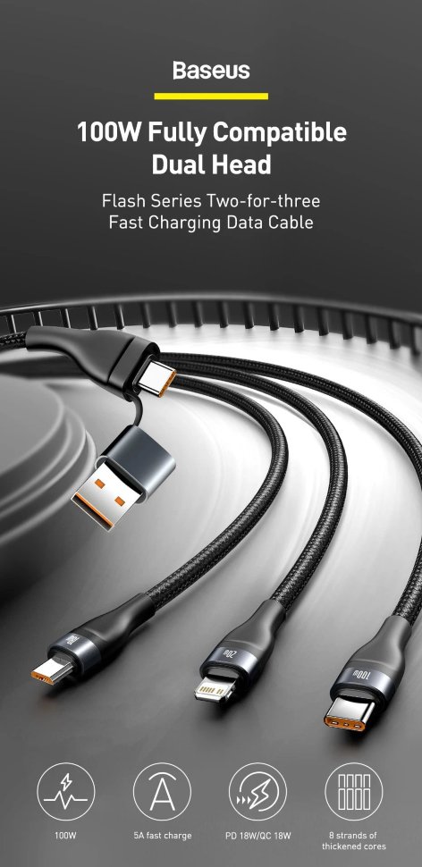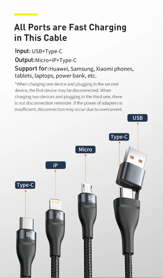 Многофункциональный кабель со множеством вариантов подключения, что делает его невероятно удобным. С одной стороны Type-C и адаптер на стандартный USB, а с другой сразу три разъёма - Type-C до 100 Вт, Lightning до 18 Вт и micro USB до 13 Вт |