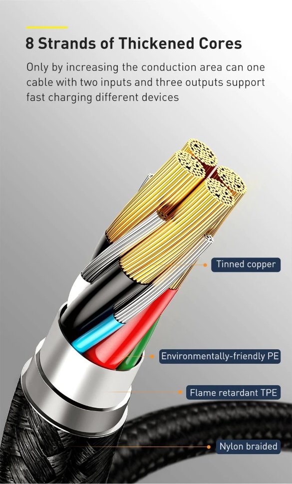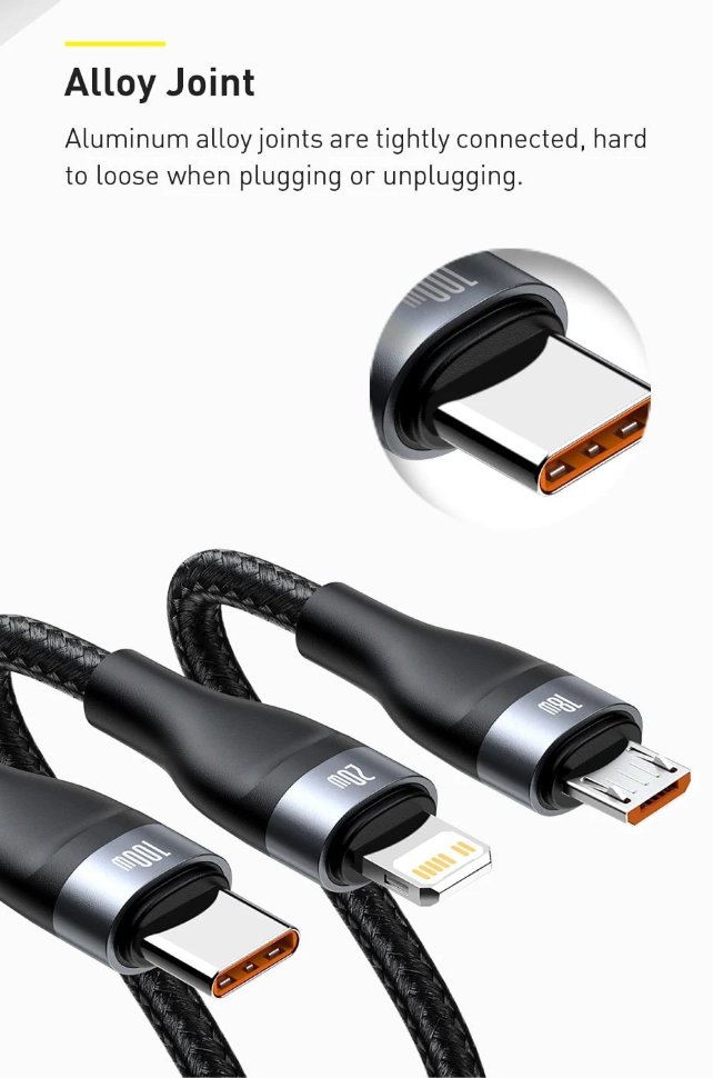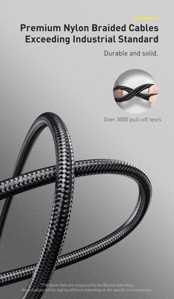 Нейлоновый кабель отличается прочностью, гибкостью и надежностью. Металлические элементы из алюминиевого сплава плотно прилегают к портам, обеспечивают стабильную и безопасную подзарядку |