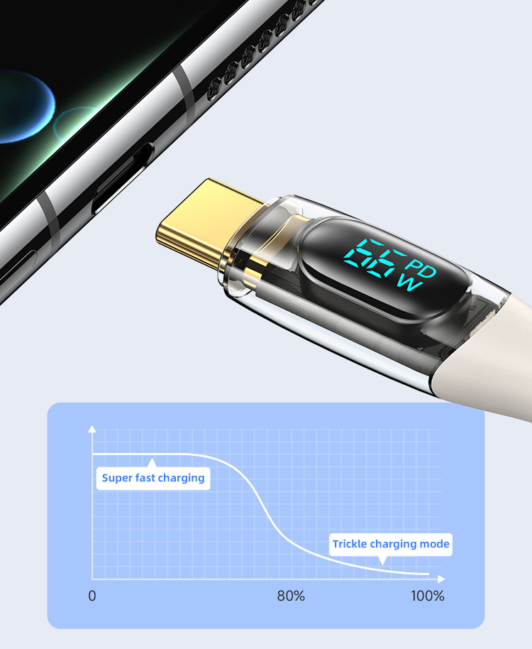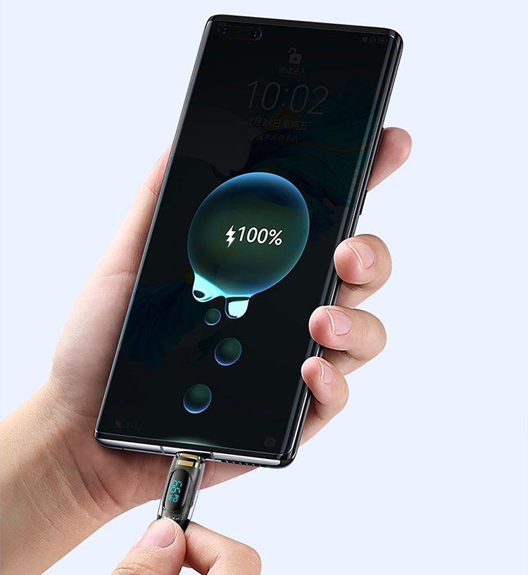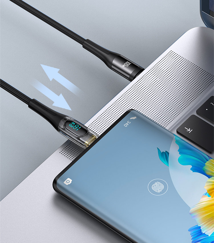 Прочный кабель с плетеной обмоткой для устройств с интерфейсом Type-C. Поддерживает девайсы мощностью до 66 Вт для зарядки и передачи файлов. Особое удобство обеспечивает наличие информативного дисплея прямо на коннекторе |