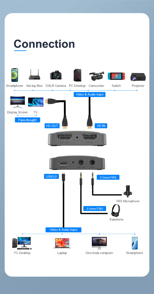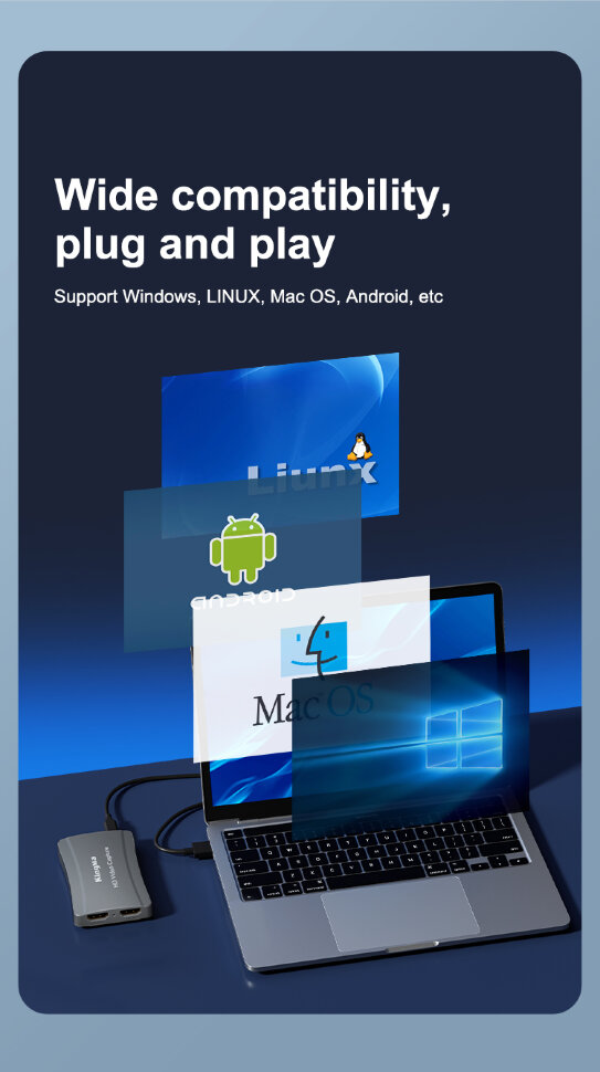 УниверсальнаКарта захвата совместима с Windows, Mac OS, Linux и Android, и поддерживает подключение к множеству источников - от смартфона и игровой консоли до цифровой камеры. Для удобства устройство оснащено множеством портов, включая HDMI 4K, Type-C 3.0, Gen 1 и аудиоразъемы 3.5 мм для микрофона и наушников, позволяя вести запись звука параллельно с видео. Интеллектуальная система охлаждения с вентиляционными решетками эффективно отводит тепло, предотвращая перегрев даже во время длительных сессий, что гарантирует стабильную работу оборудования |