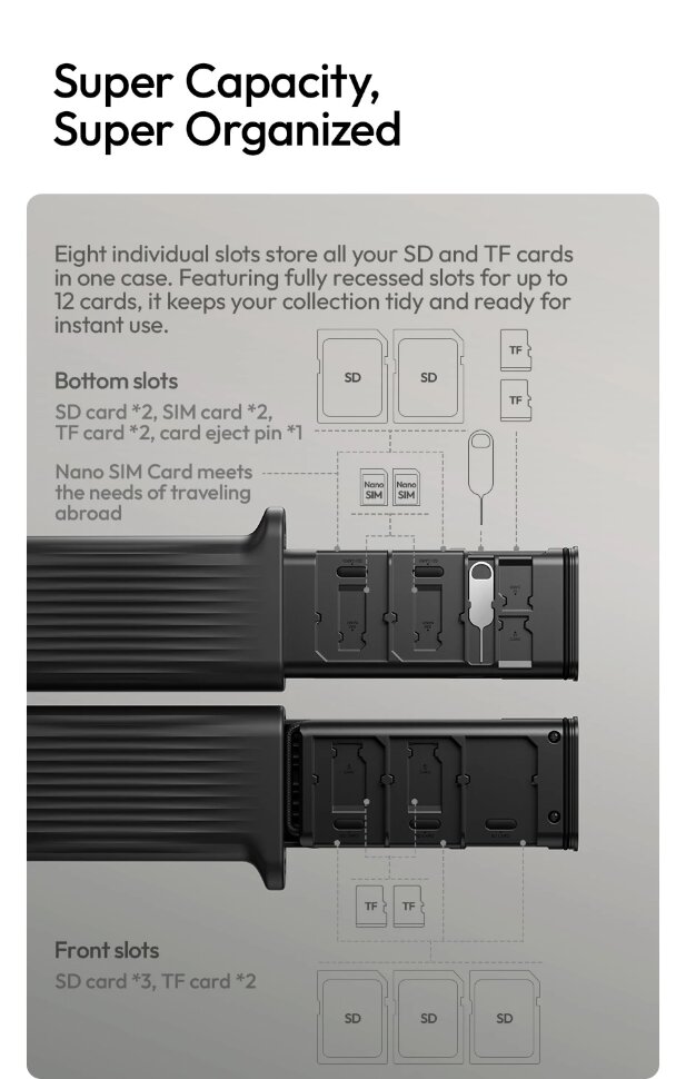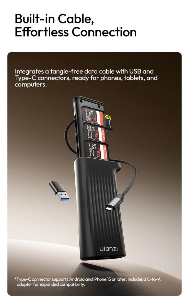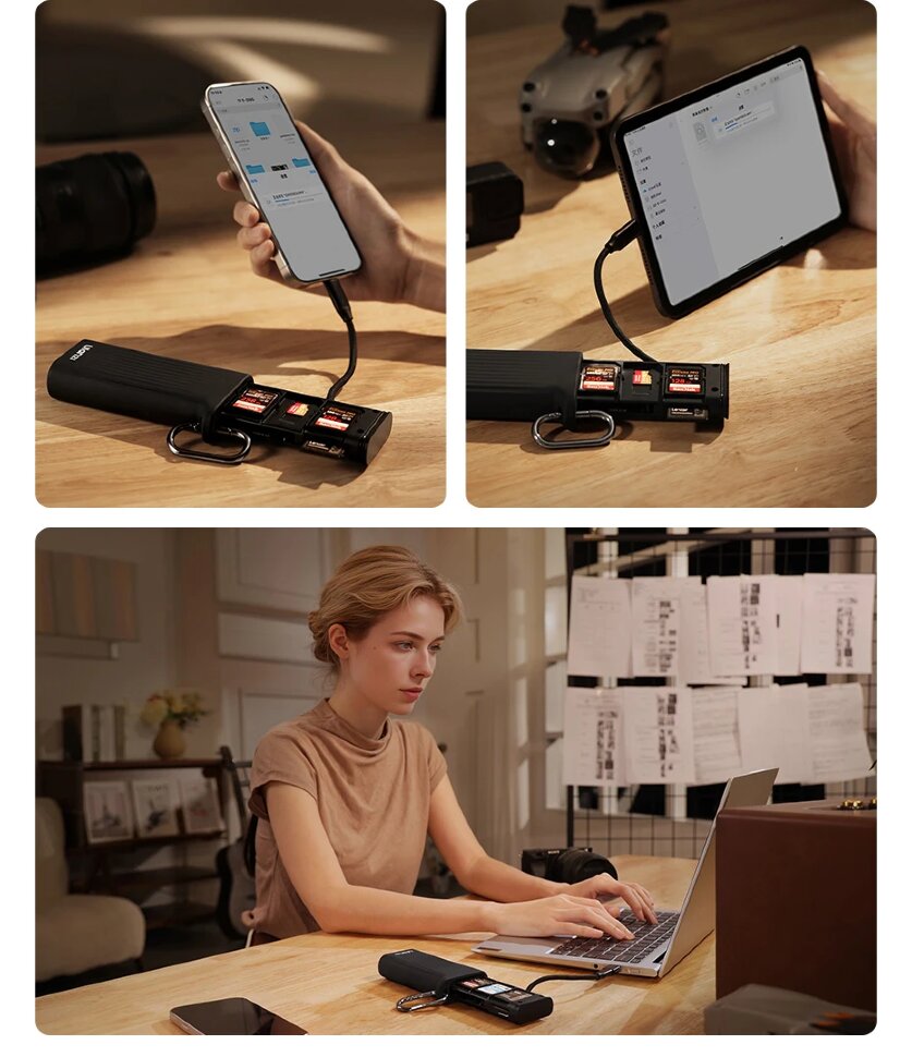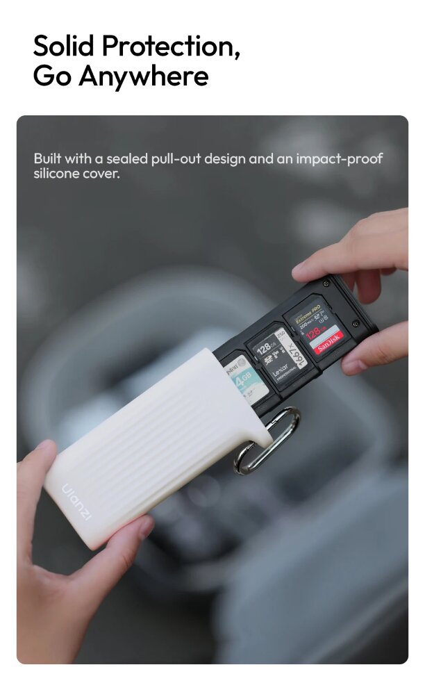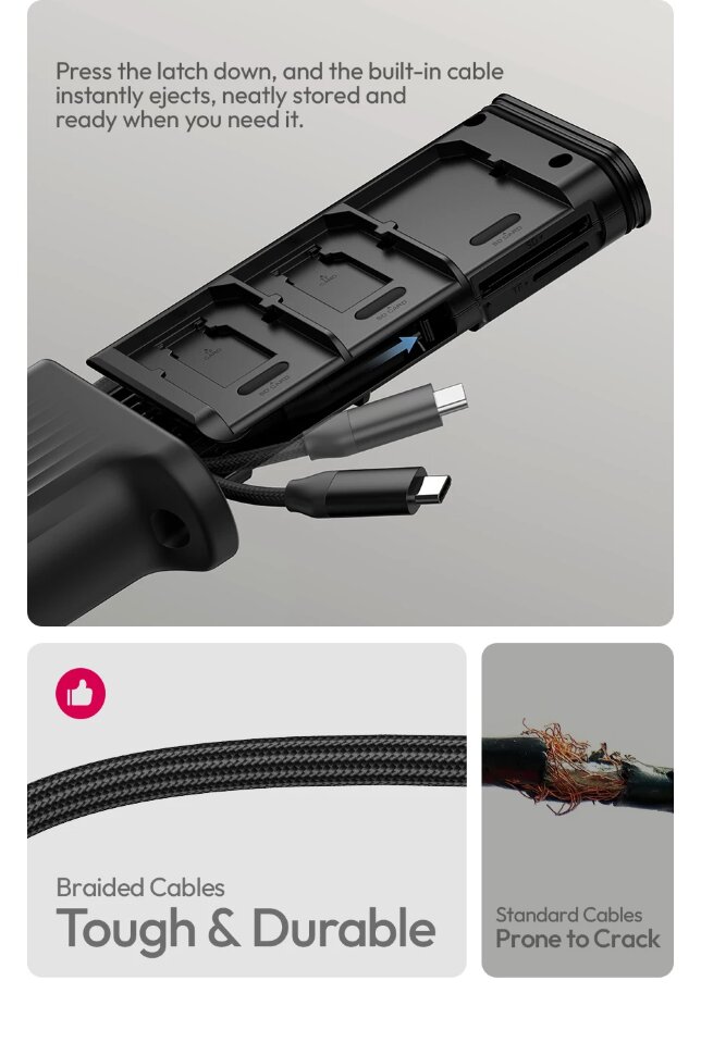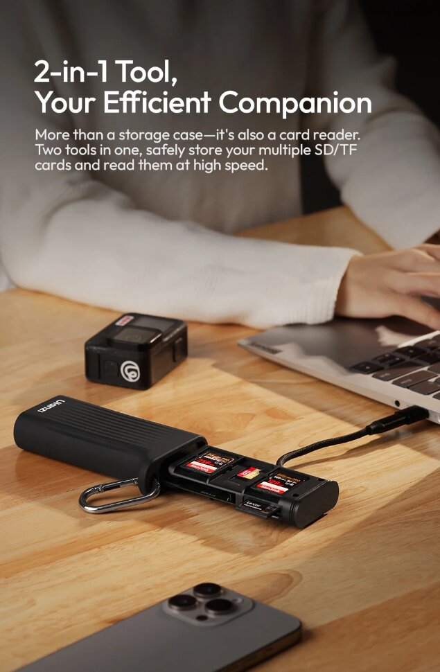 Компактный и защищенныйЭто многофункциональное устройство сочетает в себе высокоскоростной картридер и надежный кейс для хранения карт памяти. Его прочный корпус с рейтингом защиты IP54 оберегает электронику от пыли, ударов и брызг, а встроенный карабин позволяет легко закрепить его на рюкзаке или сумке для постоянного доступа. Плетеный кабель Type-C скрыт в отсеке с механизмом быстрого извлечения, что исключает спутывание и повреждение проводов |