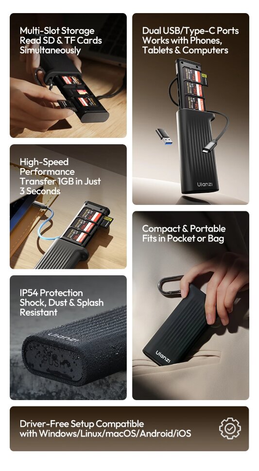 Высокоскоростная передача и одновременное чтениеОснащенный интерфейсом USB 3.1 Gen1, ридер обеспечивает скорость чтения до 312 МБ/с, позволяя перенести файл объемом 1 ГБ всего за 3 секунды. Уникальная двухслотовая архитектура поддерживает одновременное чтение карт SD и microSD (TF) без снижения скорости, что критично для оперативной работы с материалами в полевых условиях. Совместимость с картами UHS-II и автоматическое распознавание на Windows, macOS, Linux, Android и iOS избавляют от необходимости установки драйверов |