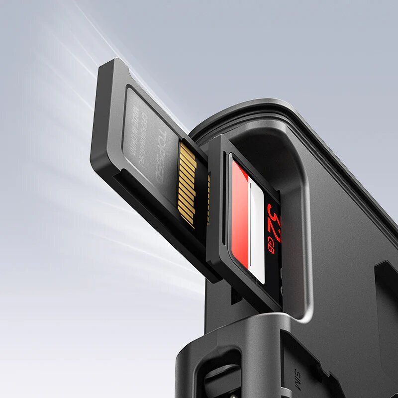 Кейс MCR-01 имеет двустороннее хранилище с отсеками для 3 карт CFexpress Type-A, 4 SD-карт, 4 Micro SD (TF), 4 nanoSIM и устройства для извлечения карт. Это обеспечивает удобную организацию и быстрый доступ ко всем носителям. Два слота для чтения/записи позволяют одновременно работать с картами CFexpress и SD, при этом приоритет отдаётся CFexpress для бесперебойной работы |