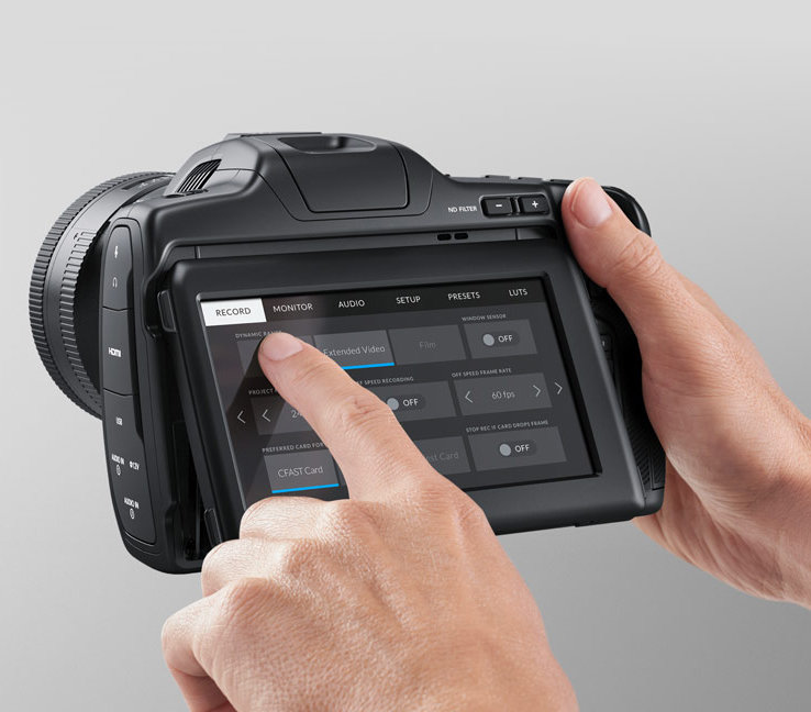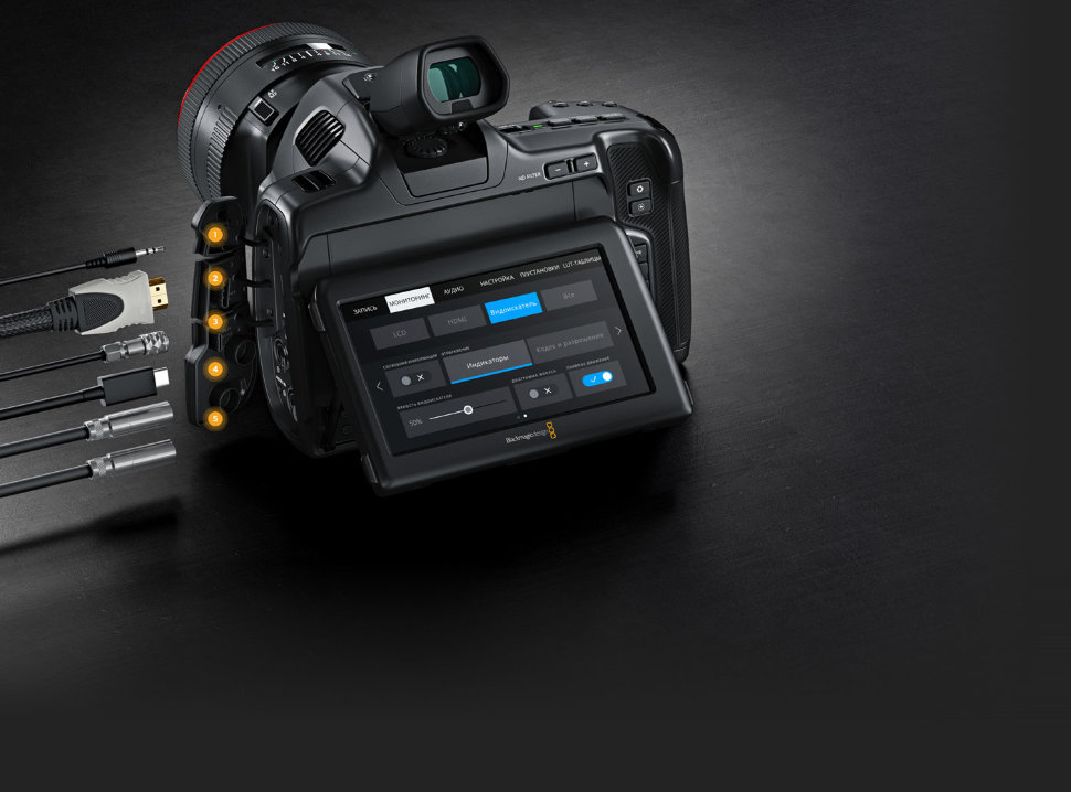 Blackmagic Pocket Cinema Camera 6K Pro имеет расширенный функционал для профессиональной съемки, в том числе встроенные светофильтры ND на две, четыре и шесть ступеней, а также регулируемый по наклону HDR-дисплей яркостью 1500 нт для комфортной работы при солнечном свете. Дополнительно предусмотрены два аудиовхода Mini XLR и возможность установки более крупной батареи типа NP-F570 |