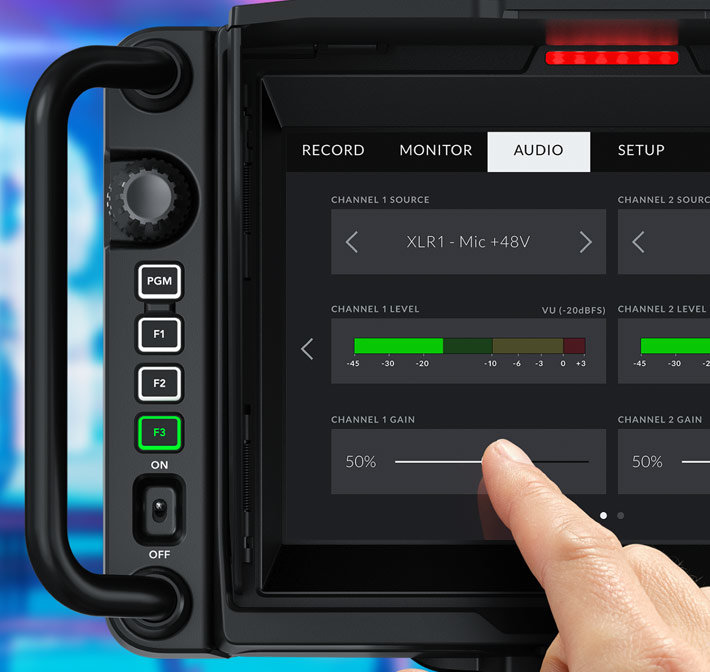 Встроенные микрофоныМодели линейки Blackmagic Studio оснащены интегрированными микрофонами, что значительно ускоряет рабочий процесс. Они обладают устойчивостью к ударам и ветру, поэтому звук отличного качества можно получить в любых условиях. Благодаря размещению по краям экрана разделение стереоканалов выполняется гораздо лучше, чем на обычной видеокамере. Дополнительно предусмотрены разъемы 3,5 мм для подключения наушников и профессиональной аудиотехники. Версия Pro также имеет входы XLR и встроенный динамик для прослушивания обратного программного сигнала |